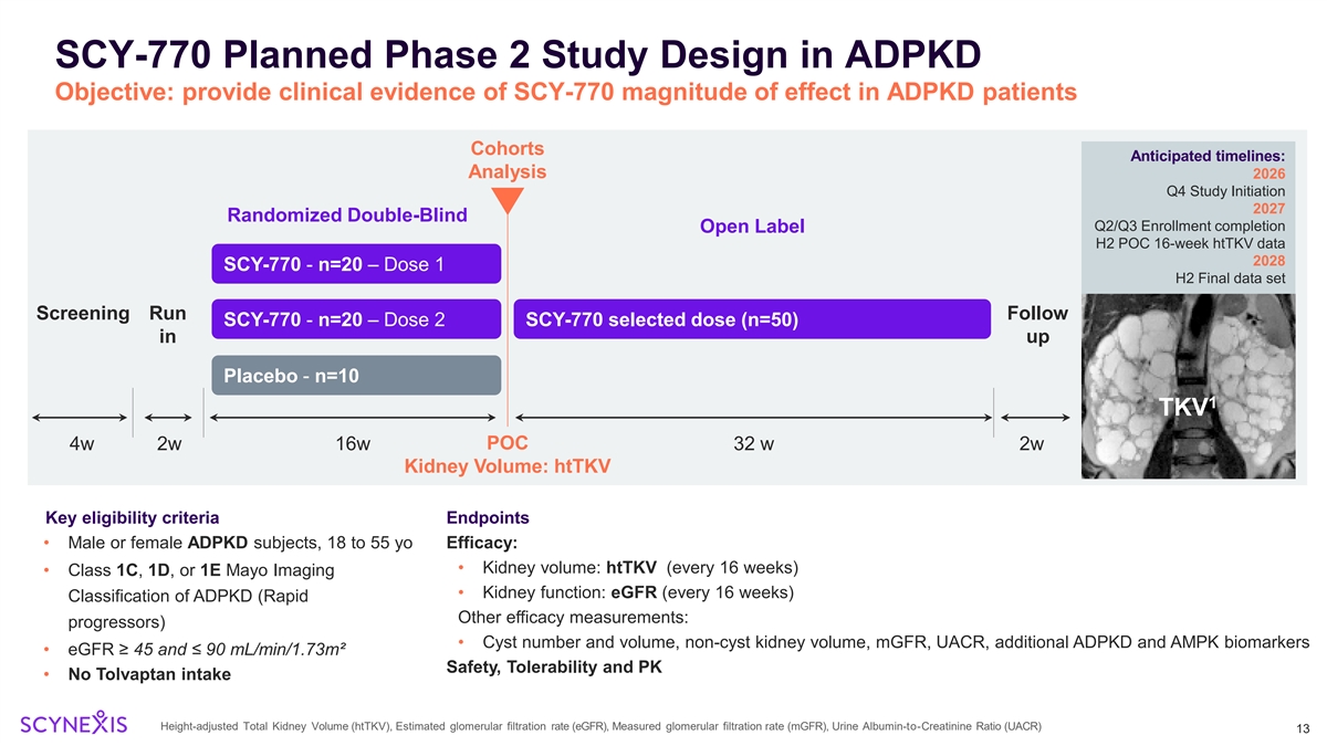 SCY-770 Illustrative Path Forward 1 Potential accelerated approval based on surrogate endpoint (htTKV) Phase 1* Phase 2 POC EoP2 Phase 3 16-week htTKV FDA inflection point 12-months 24-month htTKV eGFR NDA sNDA htTKV = measures the kidney volume changes via MRI eGFR = measures the kidney function changes Phase 1* (exposure and food effect at doses intended for Phase 2) Accelerated Full FDA FDA Approval Other development activities may include: Approval CMC optimization, scale up and registration batches, additional Phase 1 studies, additional non-clinical assessments 2026 2027 2028 2029 2030 2031 1. TKV an acceptable surrogate endpoint for accelerated approval path in PKD. https://www.fda.gov/drugs/development-resources/table-surrogate-endpoints-were-basis-drug-approval-or-licensure 12