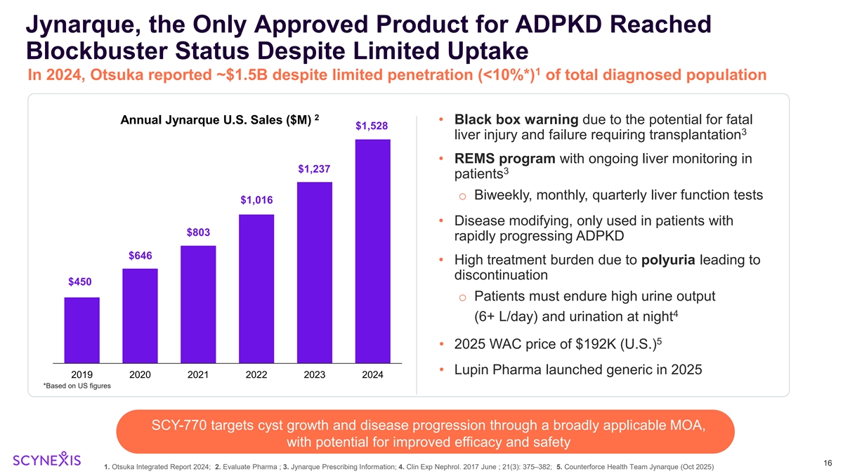ADPKD is an Orphan Indication Associated with Significant Clinical and Economic Burden 1 2 U.S. prevalence of ~140,000 patients with ~6,000 new cases diagnosed / year 1,2 1 Clinical Burden Economic Burden Kidney Impact ~$7.3B-$9.8B in incremental costs equivalent to ~$52k-$68k per individual with ADPKD o Kidney pain, gross hematuria, and urinary tract infection o Significant direct healthcare cost (~$5.7B) o More than 50% of patients reach end-stage renal disease requiring due to dialysis and renal replacement therapy renal replacement therapies Mortality 1 o 1.8 to 5.4-fold higher risk of all-cause mortality in 35 years and older QOL Impact Underserved market with only one approved treatment and significant o Limitations in physical activity, work productivity, and social interaction opportunity for new therapies o Decreased ability to work, the negative effects of a diagnosis on insurability, and the costs of medical care 1. Cloutier M, et.al. The societal economic burden of autosomal dominant polycystic kidney disease in the United States. BMC Health Serv Res. 2020 Feb 18;20(1):126.; 2. Oberdhan D, et.al. Patient- 15 Reported Outcomes Measures, Polycystic Kidney Disease Burden, and Outcomes in Autosomal Dominant Polycystic Kidney Disease. Kidney Med. 2023 Nov 27;6(1):100755.