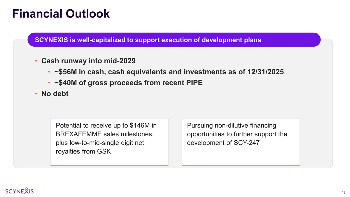 Financial Outlook SCYNEXIS is well-capitalized to support execution of development plans • Cash runway into mid-2029 • ~$56M in cash, cash equivalents and investments as of 12/31/2025 • ~$40M of gross proceeds from recent PIPE • No debt Potential to receive up to $146M in Pursuing non-dilutive financing BREXAFEMME sales milestones, opportunities to further support the plus low-to-mid-single digit net development of SCY-247 royalties from GSK 18