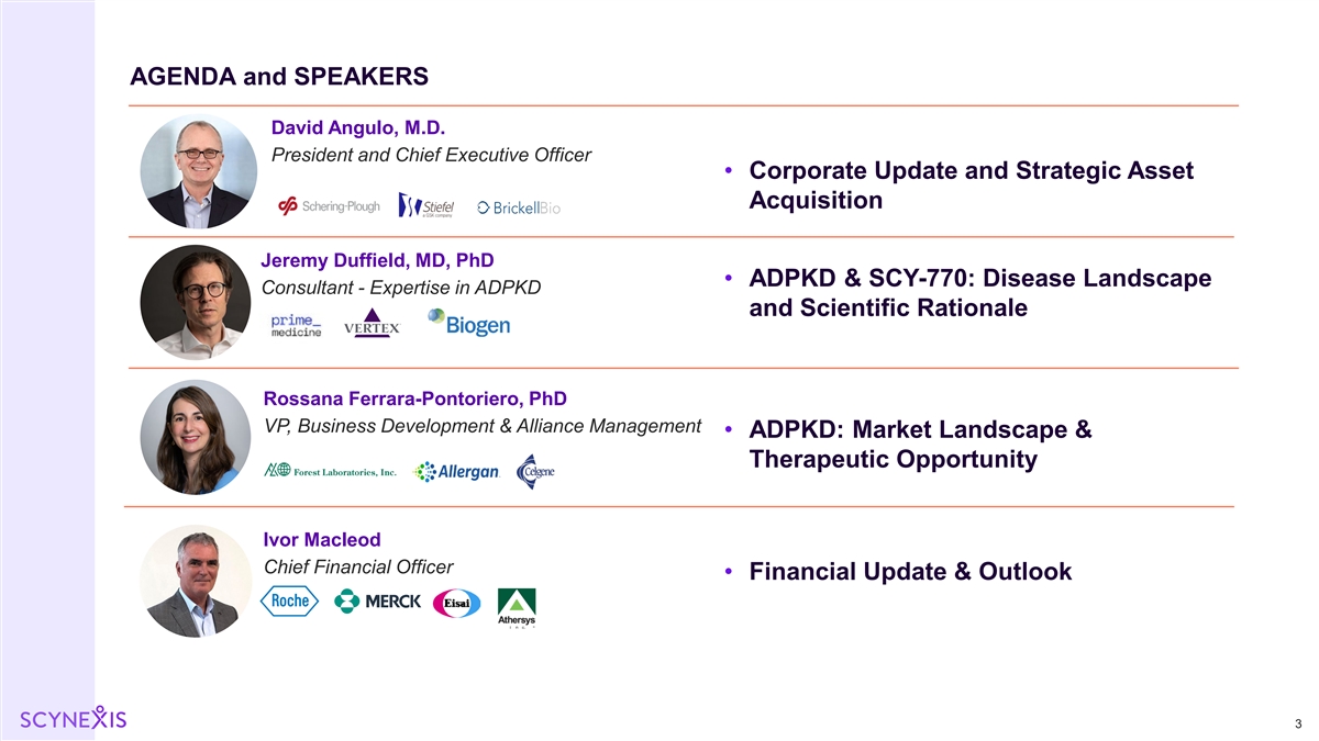 AGENDA and SPEAKERS David Angulo, M.D. President and Chief Executive Officer • Corporate Update and Strategic Asset Acquisition Jeremy Duffield, MD, PhD • ADPKD & SCY-770: Disease Landscape Consultant - Expertise in ADPKD and Scientific Rationale Rossana Ferrara-Pontoriero, PhD VP, Business Development & Alliance Management • ADPKD: Market Landscape & Therapeutic Opportunity Ivor Macleod Chief Financial Officer • Financial Update & Outlook 3