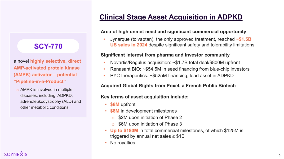 SCYNEXIS: Innovation-Driven Focus on Severe Rare Diseases Optionality & Upside from Strategic Asset Acquisition Successful $40M Financing Antifungal Assets SCY-247 SCY-770 for Autosomal Dominant Raised $40M in PIPE financing, • Oral Phase 1 completed Polycystic Kidney Disease extending our cash runway to mid • IV Phase1 results anticipated in (ADPKD), a multi-billion-dollar 2029 giving us optimal flexibility to Q3 2026 market with significant unmet need execute our strategy • Actively seeking non-dilutive • Phase 2 initiation anticipated in funding Q4 2026 • Early efficacy readout GSK-BREXAFEMME partnership expected in 2H 2027 with has potential to deliver up to $146M study completion in 2H in sales milestones + royalties 2028 Experienced Leadership with Proven Success in Drug Development, Regulatory Approvals and Assets Monetization 4