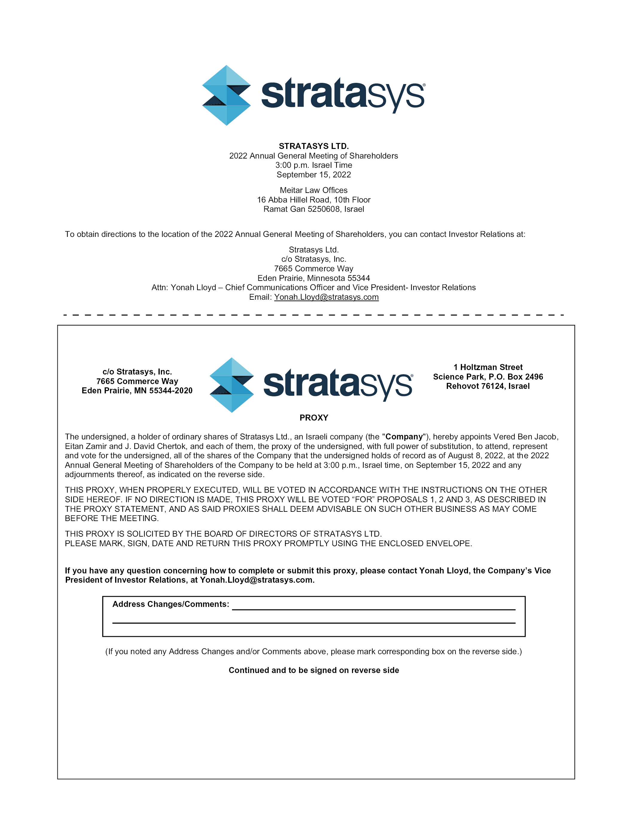 STRATASYS LTD. 2022 Annual General Meeting of Shareholders 3:00 p.m. Israel Time September 15, 2022 Meitar Law Offices 16 Abba Hillel Road, 10th Floor Ramat Gan 5250608, Israel To obtain directions to the location of the 2022 Annual General Meeting of Shareholders, you can contact Investor Relations at: Stratasys Ltd. c/o Stratasys, Inc. 7665 Commerce Way Eden Prairie, Minnesota 55344 Attn: Yonah Lloyd – Chief Communications Officer and Vice President- Investor Relations Email: Yonah.Lloyd@stratasys.com c/o Stratasys, Inc. 7665 Commerce Way Eden Prairie, MN 55344-2020 1 Holtzman Street Science Park, P.O. Box 2496 Rehovot 76124, Israel PROXY The undersigned, a holder of ordinary shares of Stratasys Ltd., an Israeli company (the “Company”), hereby appoints Vered Ben Jacob, Eitan Zamir and J. David Chertok, and each of them, the proxy of the undersigned, with full power of substitution, to attend, represent and vote for the undersigned, all of the shares of the Company that the undersigned holds of record as of August 8, 2022, at the 2022 Annual General Meeting of Shareholders of the Company to be held at 3:00 p.m., Israel time, on September 15, 2022 and any adjournments thereof, as indicated on the reverse side. THIS PROXY, WHEN PROPERLY EXECUTED, WILL BE VOTED IN ACCORDANCE WITH THE INSTRUCTIONS ON THE OTHER SIDE HEREOF. IF NO DIRECTION IS MADE, THIS PROXY WILL BE VOTED “FOR” PROPOSALS 1, 2 AND 3, AS DESCRIBED IN THE PROXY STATEMENT, AND AS SAID PROXIES SHALL DEEM ADVISABLE ON SUCH OTHER BUSINESS AS MAY COME BEFORE THE MEETING. THIS PROXY IS SOLICITED BY THE BOARD OF DIRECTORS OF STRATASYS LTD. PLEASE MARK, SIGN, DATE AND RETURN THIS PROXY PROMPTLY USING THE ENCLOSED ENVELOPE. If you have any question concerning how to complete or submit this proxy, please contact Yonah Lloyd, the Company’s Vice President of Investor Relations, at Yonah.Lloyd@stratasys.com. Address Changes/Comments: (If you noted any Address Changes and/or Comments above, please mark corresponding box on the reverse side.) Continued and to be signed on reverse side