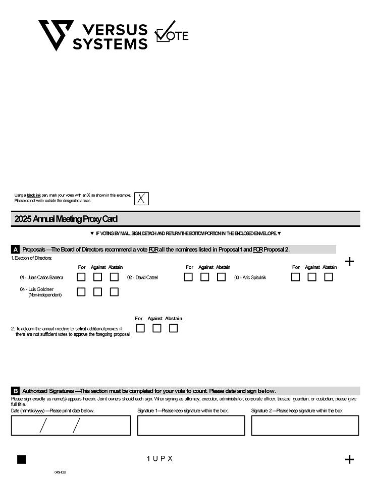 Proxy — Versus Systems, Inc. Notice of 2024 and 2025 Annual Meeting of Shareholders Proxy Solicited by Board of Directors for Annual Meeting — June 20th, 2025 Luis Goldner, or failing this person, Juan Carlos Barrera, or failing this person, Geoff Deller (the “Management Nominees”) or any of them, each with the power of substitution, are hereby authorized to represent and vote the shares of the undersigned, with all the powers which the undersigned would possess if personally present, at the Annual Meeting of Shareholders of Versus Systems, Inc . to be held on June 20 th, 2025 or at any postponement or adjournment thereof . Shares represented by this proxy will be voted by the stockholder . If no such directions are indicated, the Proxies will have authority to vote FOR the election of the Board of Directors and FOR Proposal 2 . In their discretion, the Proxies are authorized to vote upon such other business as may properly come before the meeting . (Items to be voted appear on reverse side) ხ IF VOTING BY MAIL, SIGN, DETACH AND RETURN THE BOTTOM PORTION IN THE ENCLOSED ENVELOPE. ხ