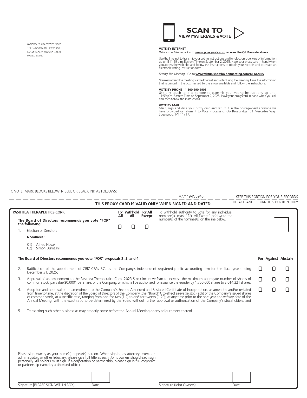 Whether or not you plan to attend the Annual Meeting, and regardless of the number of shares of common stock you own, please submit your proxy to vote as soon as possible. We urge you to date, sign and return the proxy card in the envelope provided to you, or to use the telephone or Internet method of proxy submission described on your proxy card, even if you plan to attend the Annual Meeting, so that if you are unable to attend the Annual Meeting, your shares can be voted. Any stockholder of record who submits a proxy card retains the right to revoke such proxy card by: (i) submitting a written notice of such revocation to the Chief Executive Officer of the Company so that it is received no later than 5:00 p.m., EST on September 2, 2025; (ii) submitting a duly signed proxy card bearing a later date than the previously signed and dated proxy card to the Chief Executive Officer of the Company so that it is received no later than 5:00 p.m., EST on September 2, 2025; or (iii) attending the Annual Meeting virtually and voting thereat the shares represented by such proxy card. Attendance at the Annual Meeting will not, in and of itself, constitute revocation of a completed, signed and dated proxy card previously returned. All such later-dated proxy cards or written notices revoking a proxy card should be sent to Pasithea Therapeutics Corp., 1111 Lincoln Road, Suite 500, Miami Beach, FL 33139, Attention: Tiago Reis Marques, Chief Executive Officer. If you hold shares of common stock in street name, you must contact the firm or intermediary that holds your shares to change or revoke any prior voting instructions pursuant to such firm’s or intermediary’s procedures.