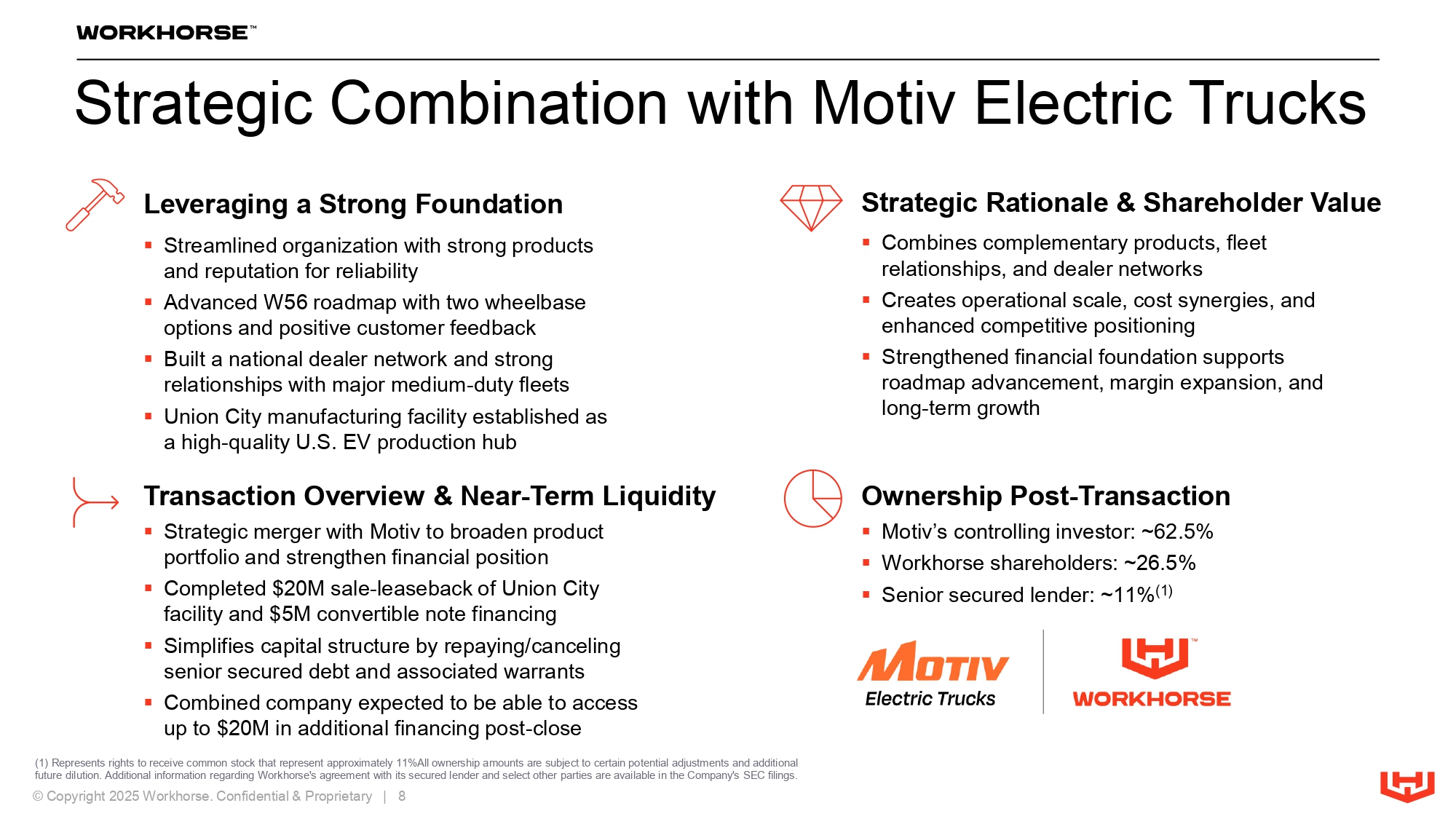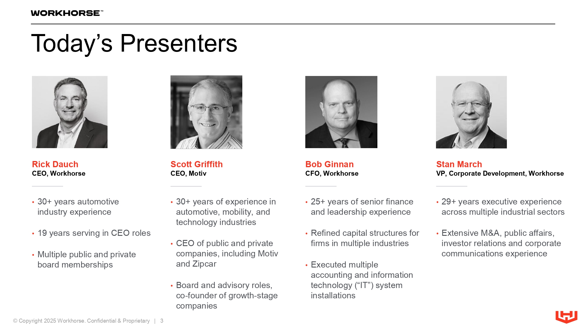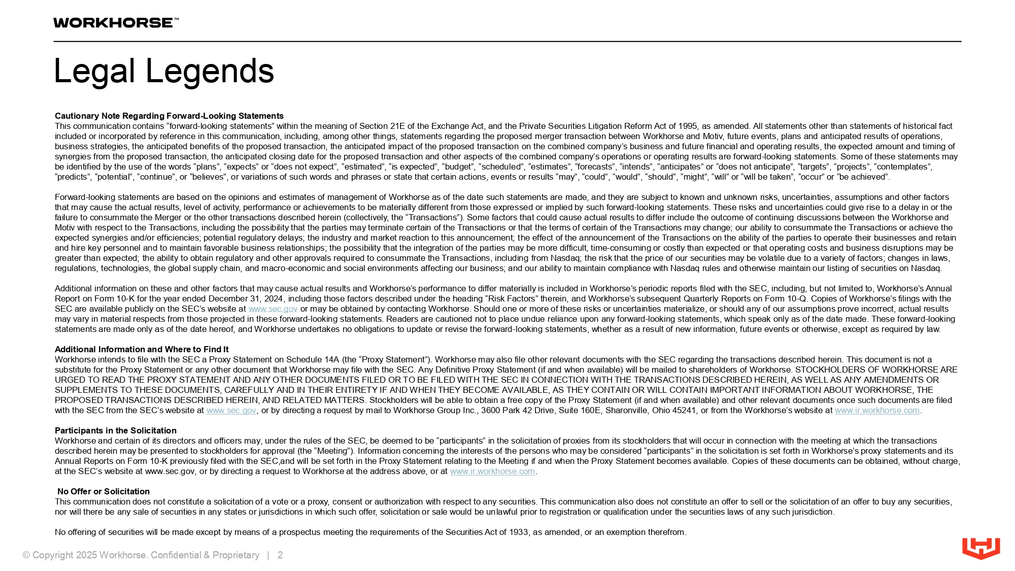 © Copyright 2025 Workhorse. Confidential & Proprietary | 2 Legal Legends Cautionary Note Regarding Forward - Looking Statements This communication contains “forward - looking statements” within the meaning of Section 21E of the Exchange Act, and the Private Securities Litigation Reform Act of 1995, as amended. All statements other than statements of historical fact included or incorporated by reference in this communication, including, among other things, statements regarding the proposed me rger transaction between Workhorse and Motiv, future events, plans and anticipated results of operations, business strategies, the anticipated benefits of the proposed transaction, the anticipated impact of the proposed transaction on the combined company’s business and future financial and operating results, the expected amount and timing of synergies from the proposed transaction, the anticipated closing date for the proposed transaction and other aspects of the c omb ined company’s operations or operating results are forward - looking statements. Some of these statements may be identified by the use of the words “plans”, “expects” or “does not expect”, “estimated”, “is expected”, “budget”, “schedul ed” , “estimates”, “forecasts”, “intends”, “anticipates” or “does not anticipate”, “targets”, “projects”, “contemplates”, “predicts”, “potential”, “continue”, or “believes”, or variations of such words and phrases or state that certain actions, ev ent s or results “may”, “could”, “would”, “should”, “might”, “will” or “will be taken”, “occur” or “be achieved”. Forward - looking statements are based on the opinions and estimates of management of Workhorse as of the date such statements are made, and they are subject to known and unknown risks, uncertainties, assumptions and other factors that may cause the actual results, level of activity, performance or achievements to be materially different from those expre sse d or implied by such forward - looking statements. These risks and uncertainties could give rise to a delay in or the failure to consummate the Merger or the other transactions described herein (collectively, the “Transactions”). Some factors tha t could cause actual results to differ include the outcome of continuing discussions between the Workhorse and Motiv with respect to the Transactions, including the possibility that the parties may terminate certain of the Transactions or that the terms of certain of the Transactions may change; our ability to consummate the Transactions or achieve the expected synergies and/or efficiencies; potential regulatory delays; the industry and market reaction to this announcement; t he effect of the announcement of the Transactions on the ability of the parties to operate their businesses and retain and hire key personnel and to maintain favorable business relationships; the possibility that the integration of the parties may be more difficult, time - consuming or costly than expected or that operating costs and business disruptions may be greater than expected; the ability to obtain regulatory and other approvals required to consummate the Transactions, includin g f rom Nasdaq; the risk that the price of our securities may be volatile due to a variety of factors; changes in laws, regulations, technologies, the global supply chain, and macro - economic and social environments affecting our business; and our a bility to maintain compliance with Nasdaq rules and otherwise maintain our listing of securities on Nasdaq. Additional information on these and other factors that may cause actual results and Workhorse’s performance to differ materia lly is included in Workhorse’s periodic reports filed with the SEC, including, but not limited to, Workhorse’s Annual Report on Form 10 - K for the year ended December 31, 2024, including those factors described under the heading “Risk Factors” the rein, and Workhorse’s subsequent Quarterly Reports on Form 10 - Q. Copies of Workhorse’s filings with the SEC are available publicly on the SEC’s website at www.sec.gov or may be obtained by contacting Workhorse. Should one or more of these risks or uncertainties materialize, or should any of ou r assumptions prove incorrect, actual results may vary in material respects from those projected in these forward - looking statements. Readers are cautioned not to place undue reliance upon any forward - looking statements, which speak only as of the date made. These forward - looking statements are made only as of the date hereof, and Workhorse undertakes no obligations to update or revise the forward - looking statements, whether as a result of new information, future events or otherwise, except as required by law. Additional Information and Where to Find It Workhorse intends to file with the SEC a Proxy Statement on Schedule 14A (the “Proxy Statement”). Workhorse may also file oth er relevant documents with the SEC regarding the transactions described herein. This document is not a substitute for the Proxy Statement or any other document that Workhorse may file with the SEC. Any Definitive Proxy Statement (i f and when available) will be mailed to shareholders of Workhorse. STOCKHOLDERS OF WORKHORSE ARE URGED TO READ THE PROXY STATEMENT AND ANY OTHER DOCUMENTS FILED OR TO BE FILED WITH THE SEC IN CONNECTION WITH THE TRANSACTIO NS DESCRIBED HEREIN, AS WELL AS ANY AMENDMENTS OR SUPPLEMENTS TO THESE DOCUMENTS, CAREFULLY AND IN THEIR ENTIRETY IF AND WHEN THEY BECOME AVAILABLE, AS THEY CONTAIN OR WILL CO NTA IN IMPORTANT INFORMATION ABOUT WORKHORSE, THE PROPOSED TRANSACTIONS DESCRIBED HEREIN, AND RELATED MATTERS. Stockholders will be able to obtain a free copy of the Proxy Statem ent (if and when available) and other relevant documents once such documents are filed with the SEC from the SEC’s website at www.sec.gov , or by directing a request by 