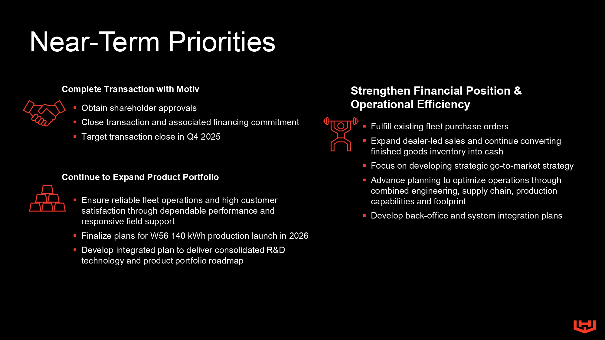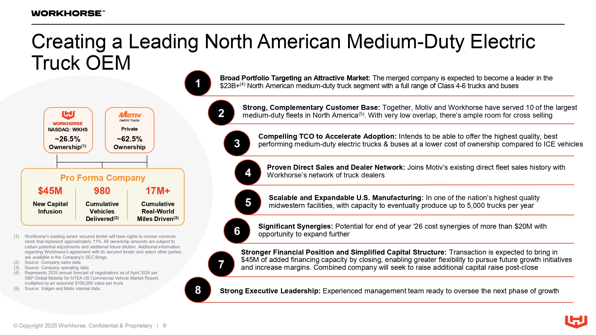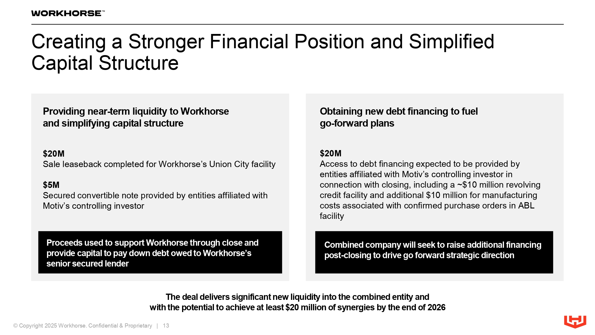 © Copyright 2025 Workhorse. Confidential & Proprietary | 2 Legal Legends Cautionary Note Regarding Forward - Looking Statements This communication contains “forward - looking statements” within the meaning of Section 21E of the Exchange Act, and the Private Securities Litigation Reform Act of 1995, as amended. All statements other than statements of historical fact included or incorporated by reference in this communication, including, among other things, statements regarding the proposed me rger transaction between Workhorse and Motiv, future events, plans and anticipated results of operations, business strategies, the anticipated benefits of the proposed transaction, the anticipated impact of the proposed transaction on the combined company’s business and future financial and operating results, the expected amount and timing of synergies from the proposed transaction, the anticipated closing date for the proposed transaction and other aspects of the c omb ined company’s operations or operating results are forward - looking statements. Some of these statements may be identified by the use of the words “plans”, “expects” or “does not expect”, “estimated”, “is expected”, “budget”, “schedul ed” , “estimates”, “forecasts”, “intends”, “anticipates” or “does not anticipate”, “targets”, “projects”, “contemplates”, “predicts”, “potential”, “continue”, or “believes”, or variations of such words and phrases or state that certain actions, ev ent s or results “may”, “could”, “would”, “should”, “might”, “will” or “will be taken”, “occur” or “be achieved”. Forward - looking statements are based on the opinions and estimates of management of Workhorse as of the date such statements are made, and they are subject to known and unknown risks, uncertainties, assumptions and other factors that may cause the actual results, level of activity, performance or achievements to be materially different from those expre sse d or implied by such forward - looking statements. These risks and uncertainties could give rise to a delay in or the failure to consummate the Merger or the other transactions described herein (collectively, the “Transactions”). Some factors tha t could cause actual results to differ include the outcome of continuing discussions between the Workhorse and Motiv with respect to the Transactions, including the possibility that the parties may terminate certain of the Transactions or that the terms of certain of the Transactions may change; our ability to consummate the Transactions or achieve the expected synergies and/or efficiencies; potential regulatory delays; the industry and market reaction to this announcement; t he effect of the announcement of the Transactions on the ability of the parties to operate their businesses and retain and hire key personnel and to maintain favorable business relationships; the possibility that the integration of the parties may be more difficult, time - consuming or costly than expected or that operating costs and business disruptions may be greater than expected; the ability to obtain regulatory and other approvals required to consummate the Transactions, includin g f rom Nasdaq; the risk that the price of our securities may be volatile due to a variety of factors; changes in laws, regulations, technologies, the global supply chain, and macro - economic and social environments affecting our business; and our a bility to maintain compliance with Nasdaq rules and otherwise maintain our listing of securities on Nasdaq. Additional information on these and other factors that may cause actual results and Workhorse’s performance to differ materia lly is included in Workhorse’s periodic reports filed with the SEC, including, but not limited to, Workhorse’s Annual Report on Form 10 - K for the year ended December 31, 2024, including those factors described under the heading “Risk Factors” the rein, and Workhorse’s subsequent Quarterly Reports on Form 10 - Q. Copies of Workhorse’s filings with the SEC are available publicly on the SEC’s website at www.sec.gov or may be obtained by contacting Workhorse. Should one or more of these risks or uncertainties materialize, or should any of ou r assumptions prove incorrect, actual results may vary in material respects from those projected in these forward - looking statements. Readers are cautioned not to place undue reliance upon any forward - looking statements, which speak only as of the date made. These forward - looking statements are made only as of the date hereof, and Workhorse undertakes no obligations to update or revise the forward - looking statements, whether as a result of new information, future events or otherwise, except as required by law. Additional Information and Where to Find It Workhorse intends to file with the SEC a Proxy Statement on Schedule 14A (the “Proxy Statement”). Workhorse may also file oth er relevant documents with the SEC regarding the transactions described herein. This document is not a substitute for the Proxy Statement or any other document that Workhorse may file with the SEC. Any Definitive Proxy Statement (i f and when available) will be mailed to shareholders of Workhorse. STOCKHOLDERS OF WORKHORSE ARE URGED TO READ THE PROXY STATEMENT AND ANY OTHER DOCUMENTS FILED OR TO BE FILED WITH THE SEC IN CONNECTION WITH THE TRANSACTIO NS DESCRIBED HEREIN, AS WELL AS ANY AMENDMENTS OR SUPPLEMENTS TO THESE DOCUMENTS, CAREFULLY AND IN THEIR ENTIRETY IF AND WHEN THEY BECOME AVAILABLE, AS THEY CONTAIN OR WILL CO NTA IN IMPORTANT INFORMATION ABOUT WORKHORSE, THE PROPOSED TRANSACTIONS DESCRIBED HEREIN, AND RELATED MATTERS. Stockholders will be able to obtain a free copy of the Proxy Statem ent (if and when available) and other relevant documents once such documents are filed with the SEC from the SEC’s website at www.sec.gov , or by directing a request by 