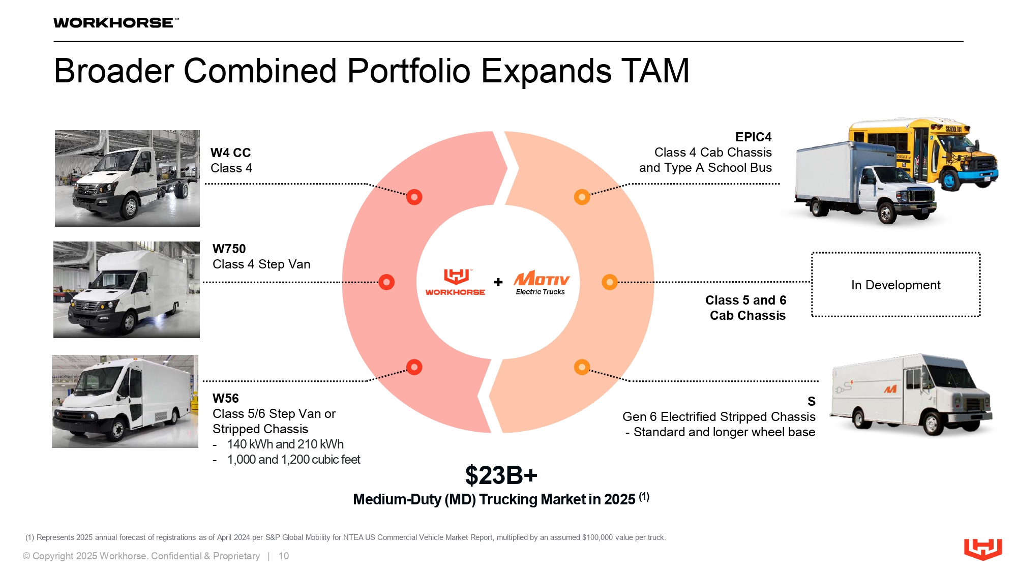 © Copyright 2025 Workhorse. Confidential & Proprietary | 9 Compelling TCO to Accelerate Adoption: Intends to be able to offer the highest quality, best performing medium - duty electric trucks & buses at a lower cost of ownership compared to ICE vehicles Broad Portfolio Targeting an Attractive Market: The merged company is expected to become a leader in the $23B+ (4) North American medium - duty truck segment with a full range of Class 4 - 6 trucks and buses Strong, Complementary Customer Base: Together, Motiv and Workhorse have served 10 of the largest medium - duty fleets in North America (5) . With very low overlap, there’s ample room for cross selling Scalable and Expandable U.S. Manufacturing: In one of the nation’s highest quality midwestern facilities, with capacity to eventually produce up to 5,000 trucks per year Strong Executive Leadership: Experienced management team ready to oversee the next phase of growth Stronger Financial Position and Simplified Capital Structure: Transaction is expected to bring in $45M of added financing capacity by closing, enabling greater flexibility to pursue future growth initiatives and increase margins. Combined company will seek to raise additional capital raise post - close Significant Synergies: Potential for end of year '26 cost synergies of more than $20M with opportunity to expand further Proven Direct Sales and Dealer Network: Joins Motiv’s existing direct fleet sales history with Workhorse’s network of truck dealers 1 2 3 5 8 7 6 4 ~ 26.5 % Ownership (1) ~62.5% Ownership Pro Forma Company 980 Cumulative Vehicles Delivered (2) 17M+ Cumulative Real - World Miles Driven (3) $45M New Capital Infusion NASDAQ: WKHS Private (1) Workhorse’s existing senior secured lender will have rights to receive common stock that represent approximately 11%. All ownership amounts are subject to certain potential adjustments and additional future dilution. Additional information regarding Workhorse’s agreement with its secured lender and select other parties are available in the Company’s SEC filings. (2) Source: Company sales data. (3) Source: Company operating data. (4) Represents 2025 annual forecast of registrations as of April 2024 per S&P Global Mobility for NTEA US Commercial Vehicle Market Report, multiplied by an assumed $100,000 value per truck. (5) Source: Valgen and Motiv internal data. Creating a Leading North American Medium - Duty Electric Truck OEM © Copyright 2025 Workhorse. Confidential & Proprietary | 9
