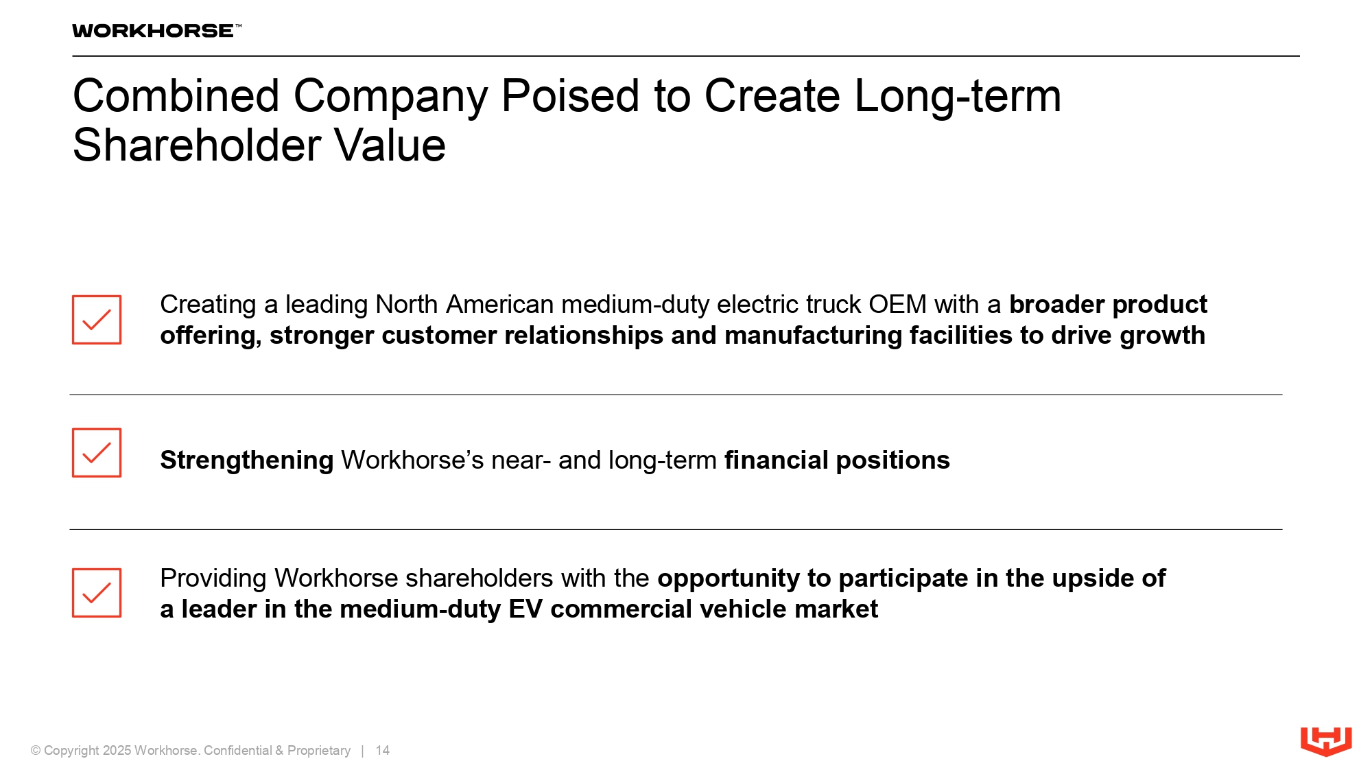 © Copyright 2025 Workhorse. Confidential & Proprietary | 13 Creating a Stronger Financial Position and Simplified Capital Structure The deal delivers significant new liquidity into the combined entity and with the potential to achieve at least $20 million of synergies by the end of 2026 Obtaining new debt financing to fuel go - forward plans Providing near - term liquidity to Workhorse and simplifying capital structure Proceeds used to support Workhorse through close and provide capital to pay down debt owed to Workhorse’s senior secured lender $20M Access to debt financing expected to be provided by entities affiliated with Motiv’s controlling investor in connection with closing, including a ~$10 million revolving credit facility and additional $10 million for manufacturing costs associated with confirmed purchase orders in ABL facility $20M S ale leaseback completed for Workhorse’s Union City facility $5M S ecured convertible note provided by entities affiliated with Motiv’s controlling investor Combined company will seek to raise additional financing post - closing to drive go forward strategic direction