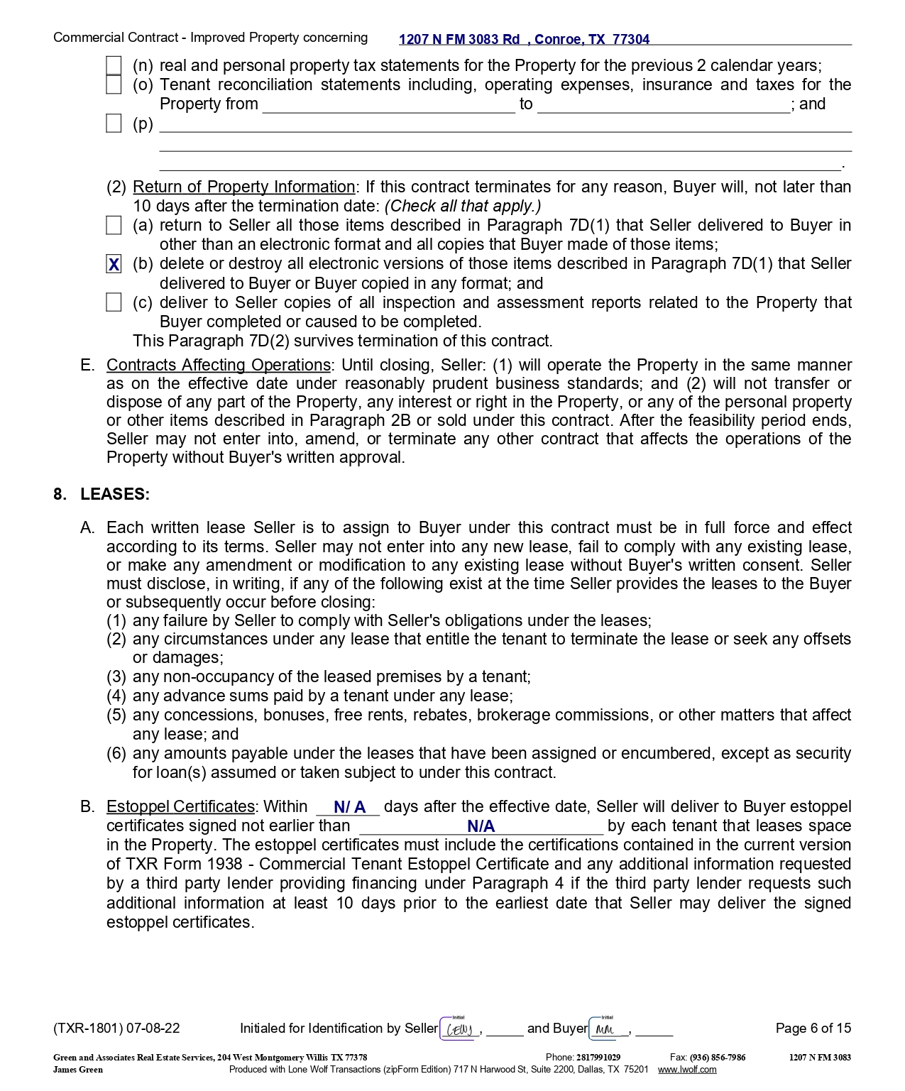 Commercial Contract - Improved Property concerning (n) real and personal property tax statements for the Property for the previous 2 calendar years; (o) Tenant reconciliation statements including, operating expenses, insurance and taxes for the Property from to ; and (p) . (2) Return of Property Information : If this contract terminates for any reason, Buyer will, not later than 10 days after the termination date: (Check all that apply.) (a) return to Seller all those items described in Paragraph 7D(1) that Seller delivered to Buyer in other than an electronic format and all copies that Buyer made of those items; (b) delete or destroy all electronic versions of those items described in Paragraph 7D(1) that Seller delivered to Buyer or Buyer copied in any format; and (c) deliver to Seller copies of all inspection and assessment reports related to the Property that Buyer completed or caused to be completed. This Paragraph 7D(2) survives termination of this contract. E . Contracts Affecting Operations : Until closing, Seller : ( 1 ) will operate the Property in the same manner as on the effective date under reasonably prudent business standards ; and ( 2 ) will not transfer or dispose of any part of the Property, any interest or right in the Property, or any of the personal property or other items described in Paragraph 2 B or sold under this contract . After the feasibility period ends, Seller may not enter into, amend, or terminate any other contract that affects the operations of the Property without Buyer's written approval . 8. LEASES: A . Each written lease Seller is to assign to Buyer under this contract must be in full force and effect according to its terms . Seller may not enter into any new lease, fail to comply with any existing lease, or make any amendment or modification to any existing lease without Buyer's written consent . Seller must disclose, in writing, if any of the following exist at the time Seller provides the leases to the Buyer or subsequently occur before closing : (1) any failure by Seller to comply with Seller's obligations under the leases; (2) any circumstances under any lease that entitle the tenant to terminate the lease or seek any offsets or damages; (3) any non - occupancy of the leased premises by a tenant; (4) any advance sums paid by a tenant under any lease; (5) any concessions, bonuses, free rents, rebates, brokerage commissions, or other matters that affect any lease; and (6) any amounts payable under the leases that have been assigned or encumbered, except as security for loan(s) assumed or taken subject to under this contract. B. Estoppel Certificates : Within N/ A days after the effective date, Seller will deliver to Buyer estoppel certificates signed not earlier than N/A by each tenant that leases space in the Property . The estoppel certificates must include the certifications contained in the current version of TXR Form 1938 - Commercial Tenant Estoppel Certificate and any additional information requested by a third party lender providing financing under Paragraph 4 if the third party lender requests such additional information at least 10 days prior to the earliest date that Seller may deliver the signed estoppel certificates . 1207 N FM 3083 Rd , Conroe, TX 77304 X (TXR - 1801) 07 - 08 - 22 Initialed for Identification by Seller , and Buyer , Page 6 of 15 Green and Associates Real Estate Services, 204 West Montgomery Willis TX 77378 Phone: 2817991029 Fax: (936) 856 - 7986 1207 N FM 3083 Produced with Lone Wolf Transactions (zipForm Edition) 717 N Harwood St, Suite 2200, Dallas, TX 75201 www.lwolf.com James Green