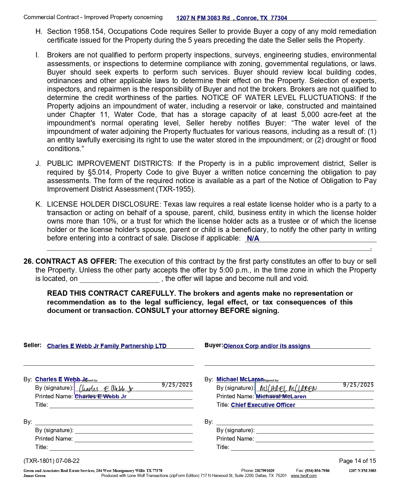 Commercial Contract - Improved Property concerning H. Section 1958 . 154 , Occupations Code requires Seller to provide Buyer a copy of any mold remediation certificate issued for the Property during the 5 years preceding the date the Seller sells the Property . I. Brokers are not qualified to perform property inspections, surveys, engineering studies, environmental assessments, or inspections to determine compliance with zoning, governmental regulations, or laws . Buyer should seek experts to perform such services . Buyer should review local building codes, ordinances and other applicable laws to determine their effect on the Property . Selection of experts, inspectors, and repairmen is the responsibility of Buyer and not the brokers . Brokers are not qualified to determine the credit worthiness of the parties . NOTICE OF WATER LEVEL FLUCTUATIONS : If the Property adjoins an impoundment of water, including a reservoir or lake, constructed and maintained under Chapter 11 , Water Code, that has a storage capacity of at least 5 , 000 acre - feet at the impoundment's normal operating level, Seller hereby notifies Buyer : “The water level of the impoundment of water adjoining the Property fluctuates for various reasons, including as a result of : ( 1 ) an entity lawfully exercising its right to use the water stored in the impoundment ; or ( 2 ) drought or flood conditions . ” J. PUBLIC IMPROVEMENT DISTRICTS : If the Property is in a public improvement district, Seller is required by 5 . 014 , Property Code to give Buyer a written notice concerning the obligation to pay assessments . The form of the required notice is available as a part of the Notice of Obligation to Pay Improvement District Assessment (TXR - 1955 ) . K. LICENSE HOLDER DISCLOSURE : Texas law requires a real estate license holder who is a party to a transaction or acting on behalf of a spouse, parent, child, business entity in which the license holder owns more than 10 % , or a trust for which the license holder acts as a trustee or of which the license holder or the license holder's spouse, parent or child is a beneficiary, to notify the other party in writing before entering into a contract of sale . Disclose if applicable : N/A . 26 . CONTRACT AS OFFER : The execution of this contract by the first party constitutes an offer to buy or sell the Property . Unless the other party accepts the offer by 5 : 00 p . m . , in the time zone in which the Property is located, on , the offer will lapse and become null and void . READ THIS CONTRACT CAREFULLY . The brokers and agents make no representation or recommendation as to the legal sufficiency, legal effect, or tax consequences of this document or transaction . CONSULT your attorney BEFORE signing . Seller: By (signature): Printed Name: Title: By: Charles E We By : By (signature) : Printed Name : Title : Buyer: Olenox Corp and/or its assigns By (signature): By: Michael McLa By : By (signature) : Printed Name : Title : 1207 N FM 3083 Rd , Conroe, TX 77304 Charles E Webb Jr Family Partnership LTD bb Jr Charles E Webb Jr ren Michaeal McLaren Printed Name: Title: Chief Executive Officer 9/25/2025 9/25/2025 (TXR - 1801) 07 - 08 - 22 Green and Associates Real Estate Services, 204 West Montgomery Willis TX 77378 Page 14 of 15 1207 N FM 3083 Phone: 2817991029 Fax: (936) 856 - 7986 James Green Produced with Lone Wolf Transactions (zipForm Edition) 717 N Harwood St, Suite 2200, Dallas, TX 75201 www.lwolf.com
