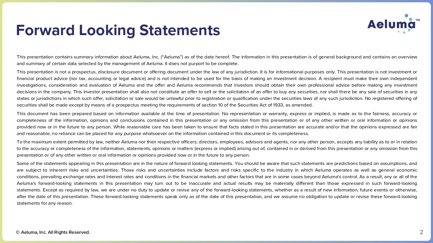 Forward Looking Statements This presentation contains summary information about Aeluma, Inc . (“Aeluma”) as of the date hereof . The information in this presentation is of general background and contains an overview and summary of certain data selected by the management of Aeluma . It does not purport to be complete . This presentation is not a prospectus, disclosure document or offering document under the law of any jurisdiction . It is for informational purposes only . This presentation is not investment or financial product advice (nor tax, accounting or legal advice) and is not intended to be used for the basis of making an investment decision . A recipient must make their own independent investigations, consideration and evaluation of Aeluma and the offer and Aeluma recommends that investors should obtain their own professional advice before making any investment decisions in the company . This investor presentation shall also not constitute an offer to sell or the solicitation of an offer to buy any securities, nor shall there be any sale of securities in any states or jurisdictions in which such offer, solicitation or sale would be unlawful prior to registration or qualification under the securities laws of any such jurisdiction . No registered offering of securities shall be made except by means of a prospectus meeting the requirements of section 10 of the Securities Act of 1933 , as amended . This document has been prepared based on information available at the time of presentation . No representation or warranty, express or implied, is made as to the fairness, accuracy or completeness of the information, opinions and conclusions contained in this presentation or any omission from this presentation or of any other written or oral information or opinions provided now or in the future to any person . While reasonable care has been taken to ensure that facts stated in this presentation are accurate and/or that the opinions expressed are fair and reasonable, no reliance can be placed for any purpose whatsoever on the information contained in this document or its completeness . To the maximum extent permitted by law, neither Aeluma nor their respective officers, directors, employees, advisors and agents, nor any other person, accepts any liability as to or in relation to the accuracy or completeness of the information, statements, opinions or matters (express or implied) arising out of, contained in or derived from this presentation or any omission from this presentation or of any other written or oral information or opinions provided now or in the future to any person . Some of the statements appearing in this presentation are in the nature of forward looking statements . You should be aware that such statements are predictions based on assumptions, and are subject to inherent risks and uncertainties . Those risks and uncertainties include factors and risks specific to the industry in which Aeluma operates as well as general economic conditions, prevailing exchange rates and interest rates and conditions in the financial markets and other factors that are in some cases beyond Aeluma's control . As a result, any or all of the Aeluma’s forward - looking statements in this presentation may turn out to be inaccurate and actual results may be materially different than those expressed in such forward - looking statements . Except as required by law, we are under no duty to update or revise any of the forward - looking statements, whether as a result of new information, future events or otherwise, after the date of this presentation . These forward - looking statements speak only as of the date of this presentation, and we assume no obligation to update or revise these forward - looking statements for any reason . 2 © Aeluma, Inc. All Rights Reserved.