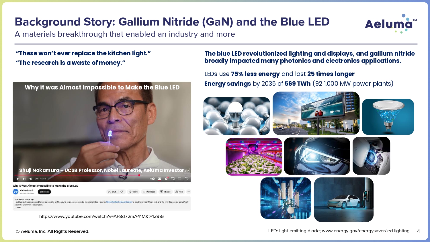 Background Story: Gallium Nitride (GaN) and the Blue LED A materials breakthrough that enabled an industry and more 4 LED: light emitting diode; www.energy.gov/energysaver/led - lighting https:// www.youtube.com/watch?v=AF8d72mA41M&t=1399s The blue LED revolutionized lighting and displays, and gallium nitride broadly impacted many photonics and electronics applications. LEDs use 75% less energy and last 25 times longer Energy savings by 2035 of 569 TWh (92 1,000 MW power plants) “These won’t ever replace the kitchen light.” “The research is a waste of money.” Why it was Almost Impossible to Make the Blue LED Shuji Nakamura – UCSB Professor, Nobel Laureate, Aeluma Investor © Aeluma, Inc. All Rights Reserved.