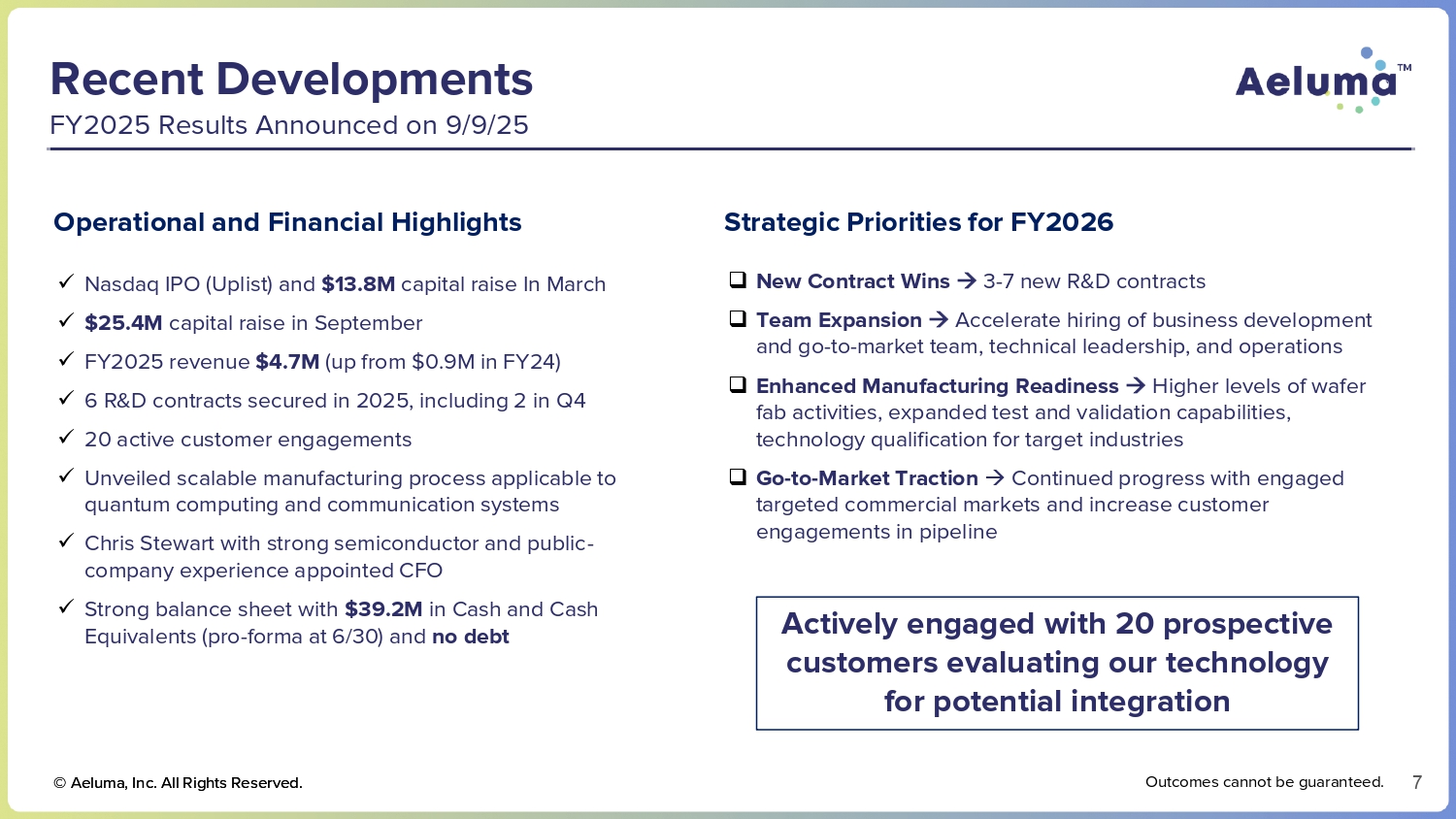 Investment Highlights Derisked business model poised for growth as U.S. recaptures semiconductor preeminence Rapidly Expanding SAM $4.9B in 2030 Broad applications across Defense and Aerospace, Mobile and Consumer Electronics, AI Infrastructure, Quantum, Industrial and Robotics, and Automotive Transformative Technology • Best - in - class materials with large - volume manufacturing • Highest performance at scale • 30+ issued and pending patents Significant Business Traction • Disruptive tech validated by U.S. agencies and customers • Sampling, small volume orders, and NRE contracts • 20 customer engagements Capital - Light Manufacturing • Primarily outsourced manufacturing for rapid scaling • Some proprietary steps carried out in house • ISO9001:2015 certified Clean Balance Sheet • No debt or overhang • $39.2M cash (pro - forma at 6/30) Attractive Financial Profile and Outlook • Recurring R&D revenue • Additional capital to fund business and accelerate commercialization © Aeluma, Inc. All Rights Reserved. SAM estimate based on internal projections; NRE: Non - recurring engineering; Outcomes cannot be guaranteed. 6