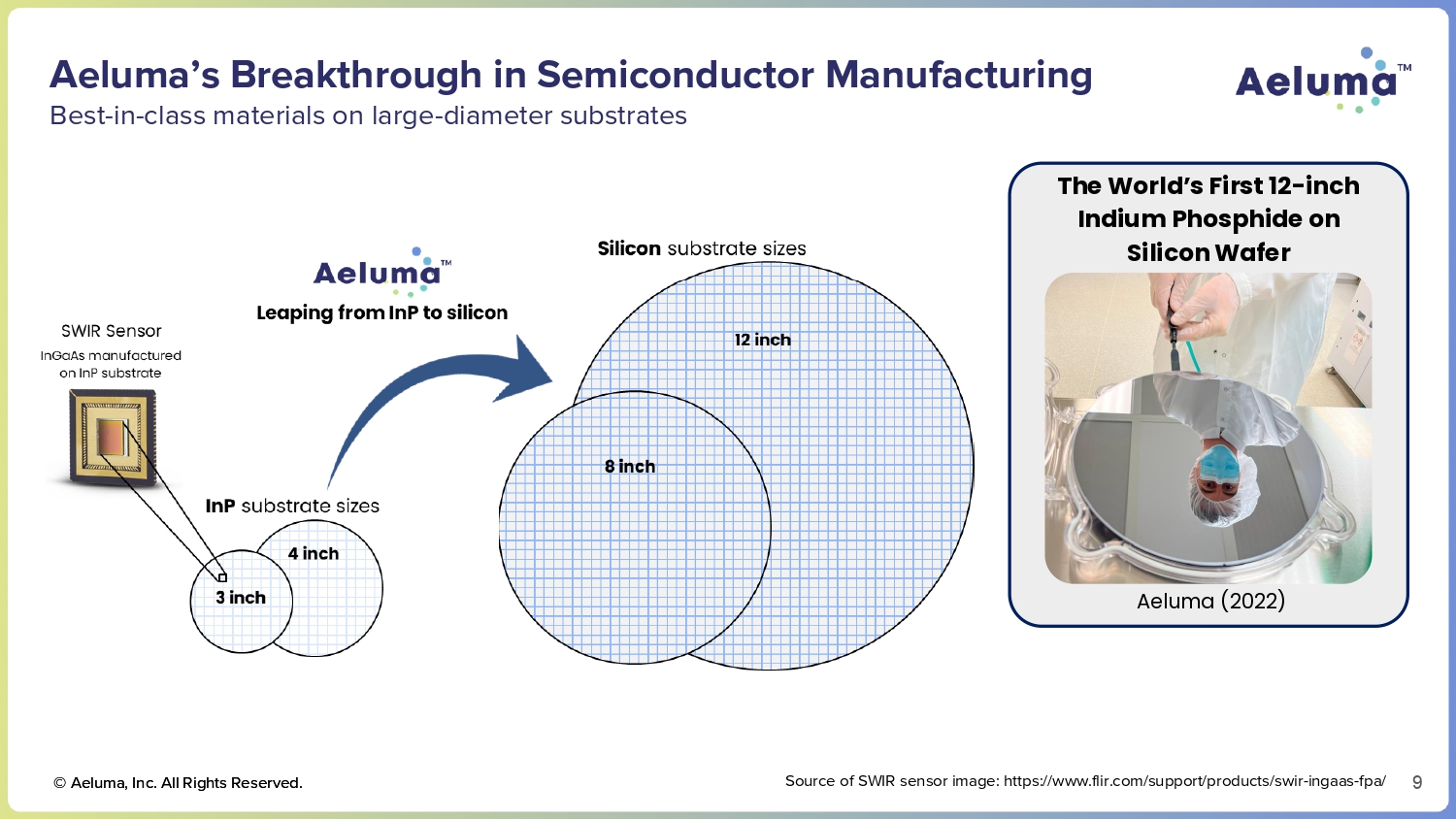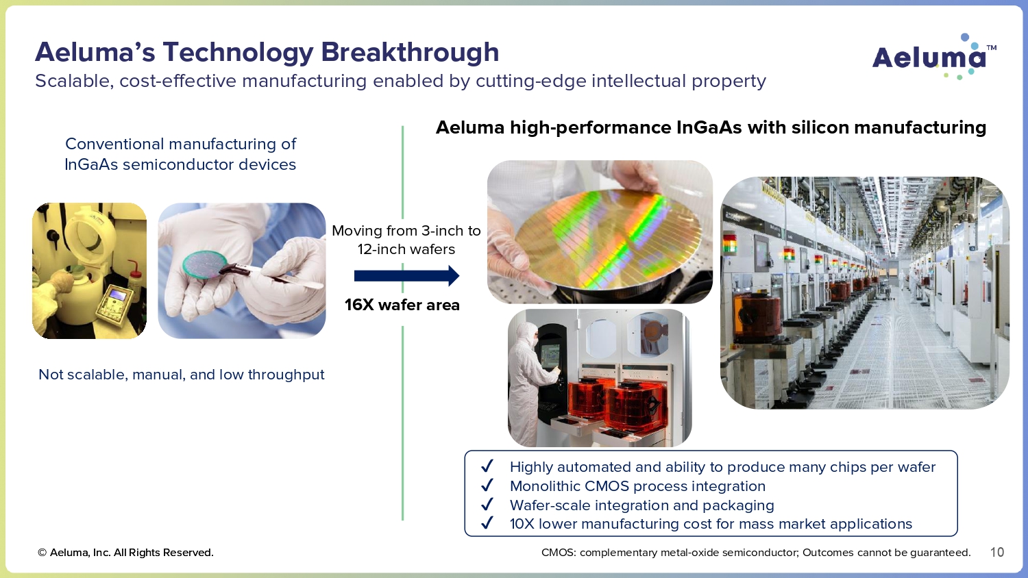 Aeluma’s Breakthrough in Semiconductor Manufacturing Best - in - class materials on large - diameter substrates 9 Source of SWIR sensor image: https:// www.flir.com/support/products/swir - ingaas - fpa/ The World’s First 12 - inch Indium Phosphide on Silicon Wafer Aeluma (2022) © Aeluma, Inc. All Rights Reserved.