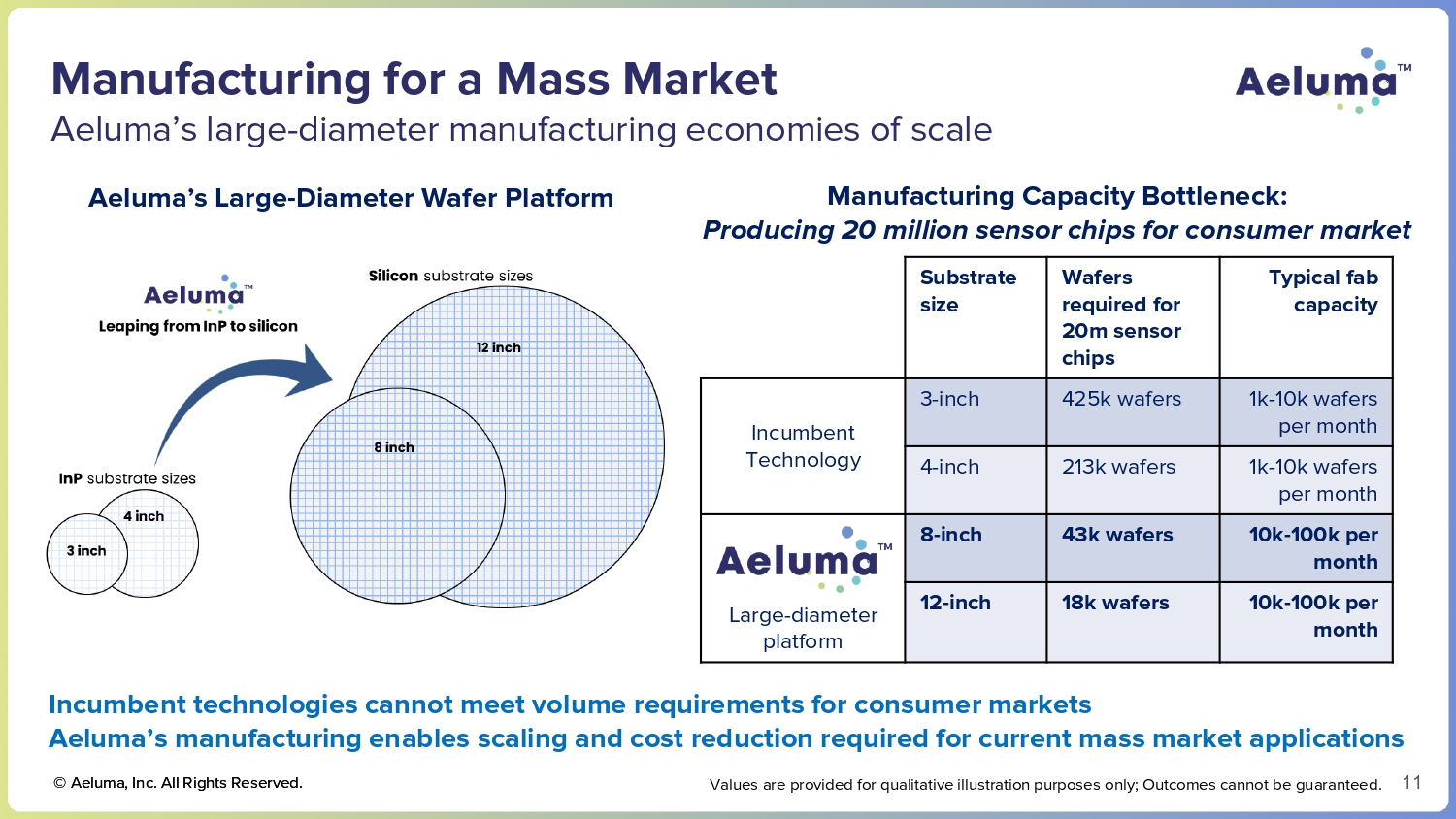 Not scalable, manual, and low throughput Highly automated and ability to produce many chips per wafer Monolithic CMOS process integration Wafer - scale integration and packaging 10X lower manufacturing cost for mass market applications CMOS: complementary metal - oxide semiconductor; Outcomes cannot be guaranteed. Aeluma’s Technology Breakthrough Scalable, cost - effective manufacturing enabled by cutting - edge intellectual property Aeluma high - performance InGaAs with silicon manufacturing Conventional manufacturing of InGaAs semiconductor devices Moving from 3 - inch to 12 - inch wafers 16X wafer area 10 © Aeluma, Inc. All Rights Reserved.