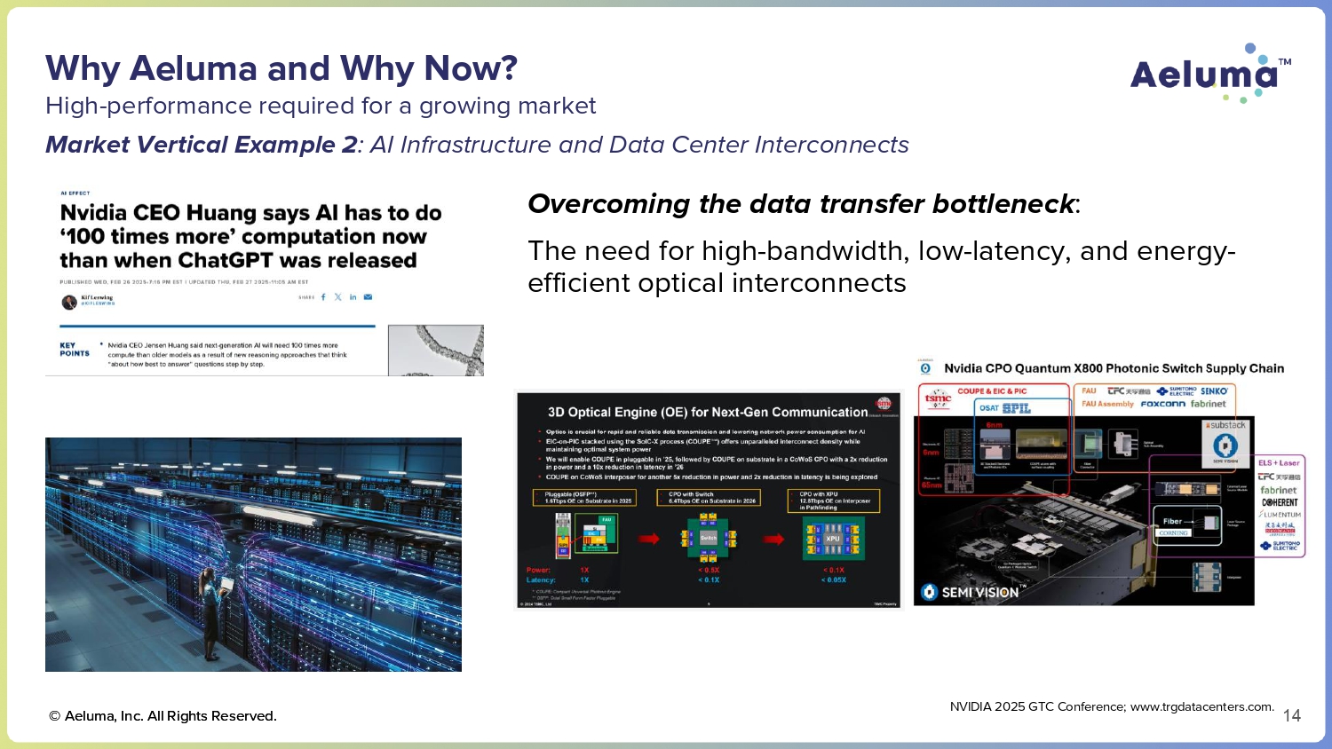 Why Aeluma and Why Now? High - performance required for a growing market Market Vertical Example 2 : AI Infrastructure and Data Center Interconnects Overcoming the data transfer bottleneck : The need for high - bandwidth, low - latency, and energy - efficient optical interconnects NVIDIA 2025 GTC Conference; www.trgdatacenters.com. © Aeluma, Inc. All Rights Reserved. 14