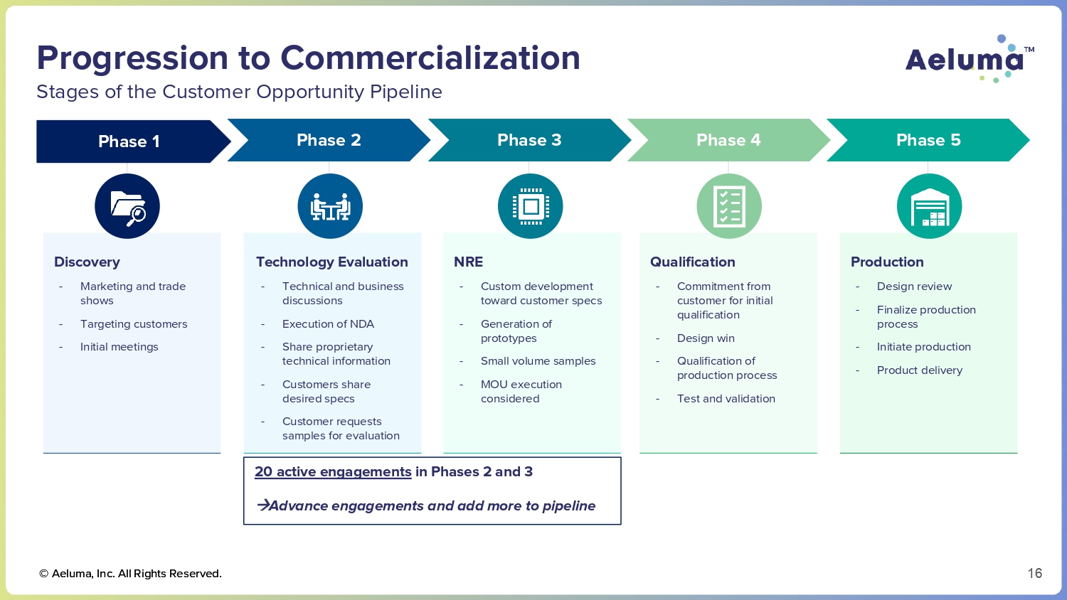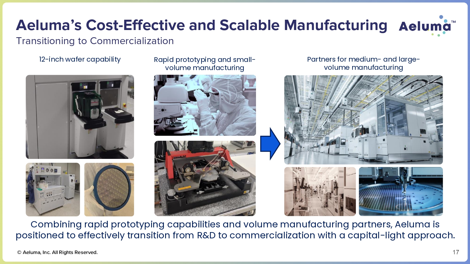 Discovery - Marketing and trade shows - Targeting customers - Initial meetings Qualification - Commitment from customer for initial qualification - Design win - Qualification of production process - Test and validation Phase 1 Phase 2 Phase 3 Phase 4 Phase 5 Production © Aeluma, Inc. All Rights Reserved. 16 - Design review - Finalize production process - Initiate production - Product delivery NRE - Custom development toward customer specs - Generation of prototypes - Small volume samples - MOU execution considered Technology Evaluation - Technical and business discussions - Execution of NDA - Share proprietary technical information - Customers share desired specs - Customer requests samples for evaluation 20 active engagements in Phases 2 and 3 Advance engagements and add more to pipeline Progression to Commercialization Stages of the Customer Opportunity Pipeline