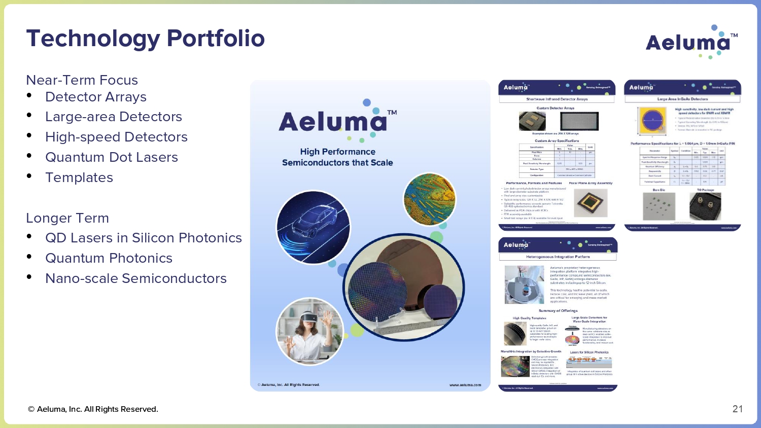 Technology Portfolio © Aeluma, Inc. All Rights Reserved. 21 Near - Term Focus • Detector Arrays • Large - area Detectors • High - speed Detectors • Quantum Dot Lasers • Templates Longer Term • QD Lasers in Silicon Photonics • Quantum Photonics • Nano - scale Semiconductors