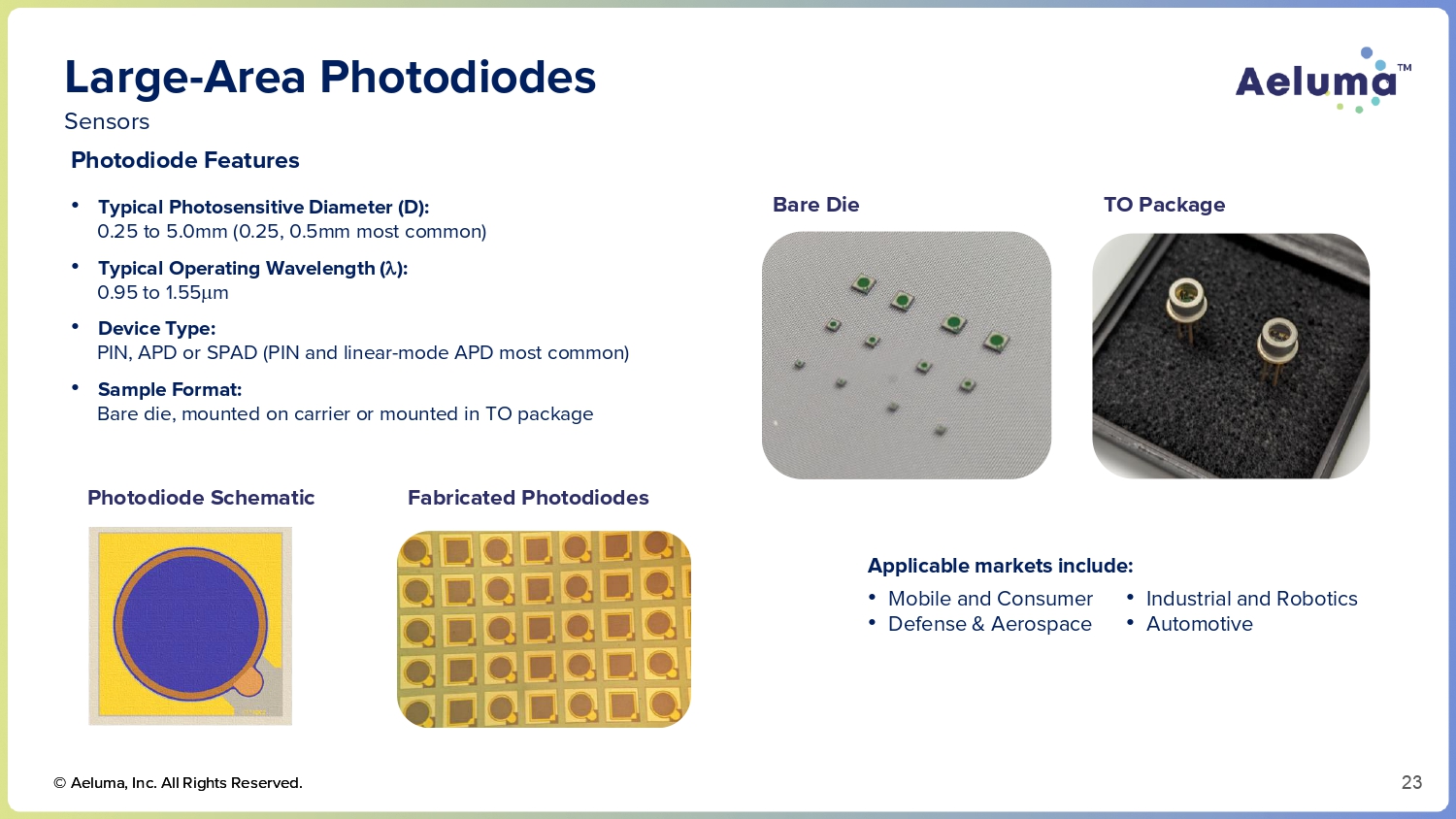 SWIR Photodiode Arrays Active and Passive Imaging Sensors Shortwave Infrared (SWIR) Array Features • Low dark current photodetector arrays manufactured with large - diameter substrate platform • Pixel and array size customizable • Typical array sizes: 128X32, 256X128, 640X512 • Delivered as PDA chips or with ROICs • FPA assembly available • Small test arrays (ex. 8 X 8) available for evaluation/qualification Examples shown are 256X128 format Focal Plane Array Assembly Evaluation Board PDA: photodetector array; ROIC: read - out integrated circuit; FPA: focal plane array © Aeluma, Inc. All Rights Reserved. 22 Photodetector Array Chips • Mobile and Consumer • Defense & Aerospace • Industrial and Robotics • Automotive Applicable markets include: