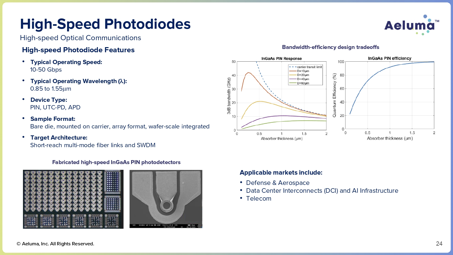 High - Speed Photodiodes Bandwidth - efficiency design tradeoffs High - speed Optical Communications High - speed Photodiode Features © Aeluma, Inc. All Rights Reserved. 24 • Typical Operating Speed: 10 - 50 Gbps • Typical Operating Wavelength ( ): 0.85 to 1.55 m • Device Type: PIN, UTC - PD, APD • Sample Format: Bare die, mounted on carrier, array format, wafer - scale integrated • Target Architecture: Short - reach multi - mode fiber links and SWDM Fabricated high - speed InGaAs PIN photodetectors Applicable markets include: • Defense & Aerospace • Data Center Interconnects (DCI) and AI Infrastructure • Telecom