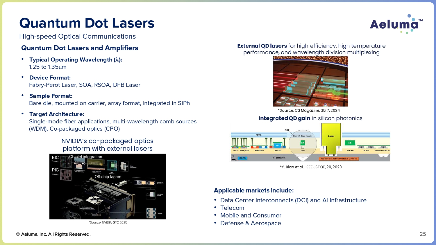 Quantum Dot Lasers Applicable markets include: • Data Center Interconnects (DCI) and AI Infrastructure • Telecom • Mobile and Consumer • Defense & Aerospace High - speed Optical Communications Quantum Dot Lasers and Amplifiers • Typical Operating Wavelength ( ): 1.25 to 1.35 m • Device Format: Fabry - Perot Laser, SOA, RSOA, DFB Laser • Sample Format: Bare die, mounted on carrier, array format, integrated in SiPh • Target Architecture: Single - mode fiber applications, multi - wavelength comb sources (WDM), Co - packaged optics (CPO) NVIDIA’s co - packaged optics platform with external lasers © Aeluma, Inc. All Rights Reserved. 25