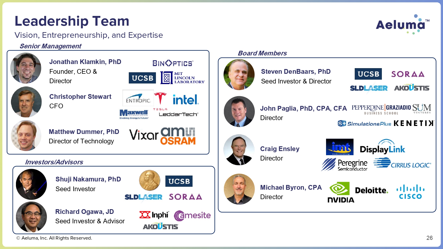 Leadership Team Steven DenBaars, PhD Seed Investor & Director John Paglia, PhD, CPA, CFA Director Craig Ensley Director Shuji Nakamura, PhD Seed Investor Richard Ogawa, JD Seed Investor & Advisor Vision, Entrepreneurship, and Expertise Senior Management Board Members Investors/Advisors Michael Byron, CPA Director Jonathan Klamkin, PhD Founder, CEO & Director Christopher Stewart CFO Matthew Dummer, PhD Director of Technology © Aeluma, Inc. All Rights Reserved. 26