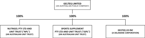 We currently have three direct, wholly-owned subsidiaries as part of our organizational structure: Nutrigel Pty Ltd and Unit Trust (“NPL”), Sport Supplements Pty Ltd and Unit Trust (“SSPL”) and Gelteq US Inc.