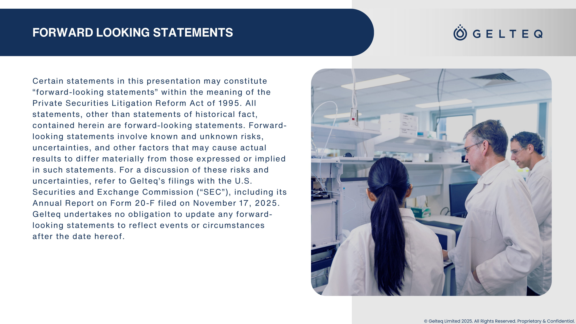 FORWARD LOOKING STATEMENTS © Gelteq Limited 2025. All Rights Reserved. Proprietary & Confidential. Ce rt ain st a t emen ts in t hi s pr e s en t a t ion ma y con st i tut e “ fo rw a r d - looking st a t emen ts ” w i t hin t he meaning of t he P r i v a t e Sec ur i t ie s Li t iga t ion Refo r m Ac t of 1995. All st a t emen ts , o t he r t han st a t emen ts of hi st o r ical fac t , con t ained he r ein a r e fo rw a r d - looking st a t emen ts. Fo rw a r d - looking st a t emen ts in v ol v e kno w n and u nkno w n r i s k s , u nce rt ain t ie s , and o t he r fac t o rs t ha t ma y ca us e ac tu al r e su l ts t o diffe r ma t e r iall y f r om t ho s e e xpr e ss ed o r im p lied in su ch st a t emen ts. Fo r a di s c uss ion of t he s e r i s k s and u nce rt ain t ie s , r efe r t o Gel t e q ’ s filing s w i t h t he U . S . Sec ur i t ie s and E x change Commi ss ion (“ SEC ”), incl u ding i ts Ann u al Re p o rt on Fo r m 20 - F filed on No v embe r 17 , 2025. Gel t e q u nde rt ake s no obliga t ion t o up da t e an y fo rw a r d - looking st a t emen ts t o r eflec t e v en ts o r ci r c u m st ance s af t e r t he da t e he r eof .