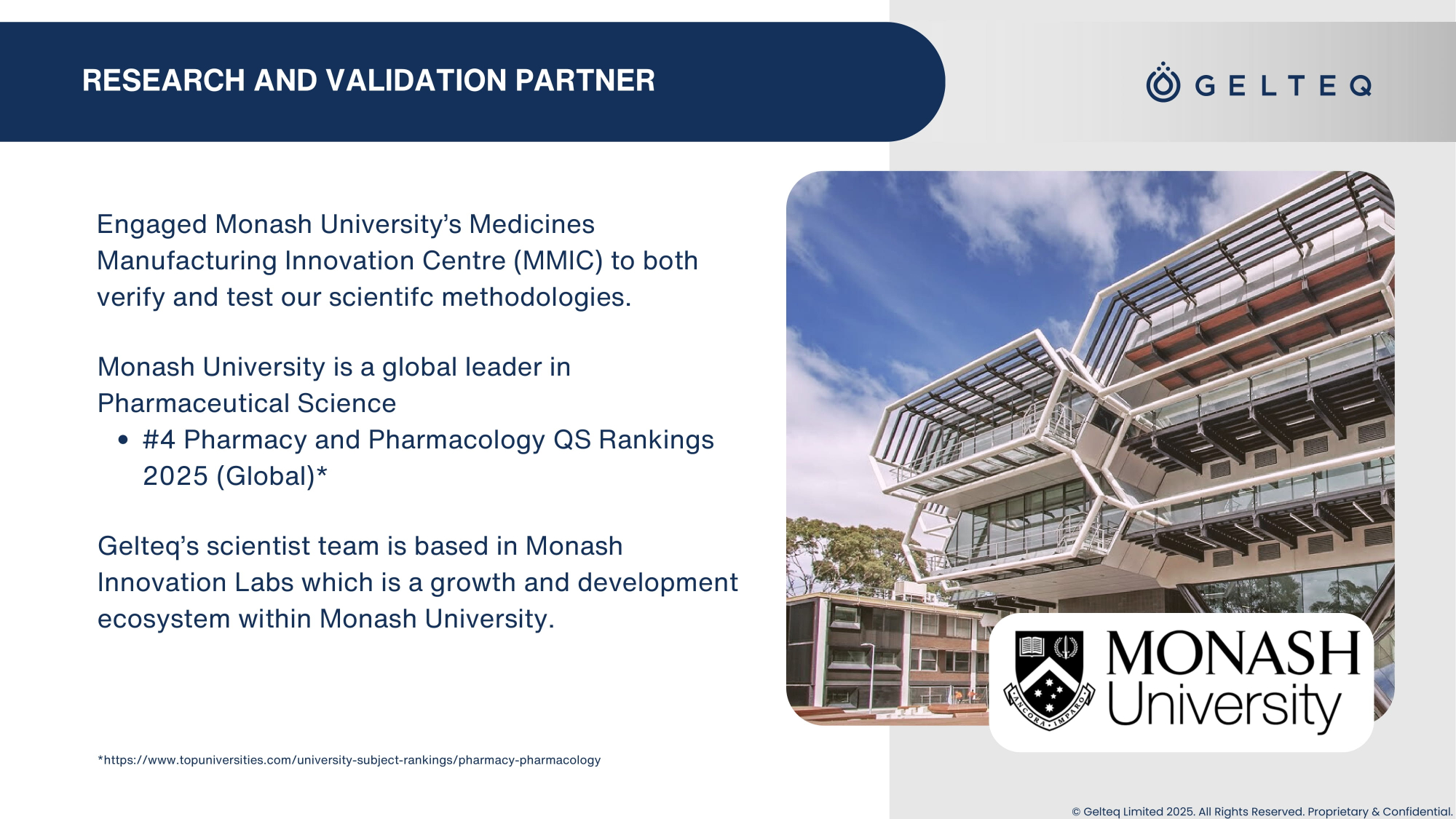 RESEARCH AND VALIDATION PARTNER Engaged Mona s h Uni v e rs i ty ’ s Medicine s Man u fac tur ing Inno v a t ion Cen tr e ( MMIC ) t o bo t h v e r if y and t e st o ur s cien t ifc me t hodologie s. Mona s h Uni v e rs i ty i s a global leade r in Pha r mace ut ical Science # 4 Pha r mac y and Pha r macolog y QS Ranking s 2025 ( Global )* Gel t e q ’ s s cien t i st t eam i s ba s ed in Mona s h Inno v a t ion Lab s w hich i s a g r o wt h and de v elo p men t eco syst em w i t hin Mona s h Uni v e rs i ty. © Gelteq Limited 2025. All Rights Reserved. Proprietary & Confidential. * h ttps :// www.t o pu ni v e rs i t ie s. com / u ni v e rs i ty - su bjec t - r anking s / p ha r mac y - p ha r macolog y