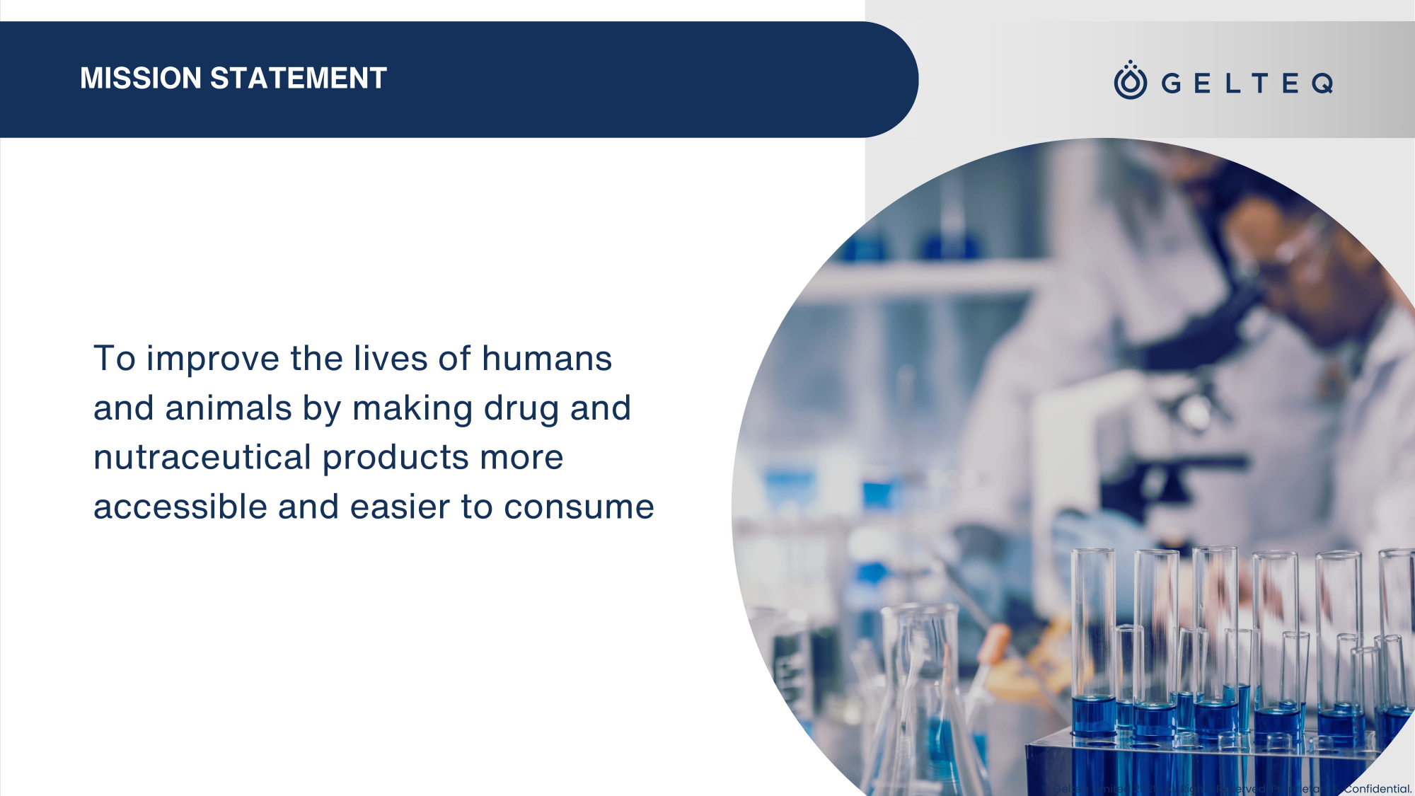 To im pr o v e t he li v e s of h u man s and animal s b y making d ru g and n utr ace ut ical pr od u c ts mo r e acce ss ible and ea s ie r t o con su me © Gelteq Limited 2025. All Rights Reserved. Proprietary & Confidential. MISSION STATEMENT