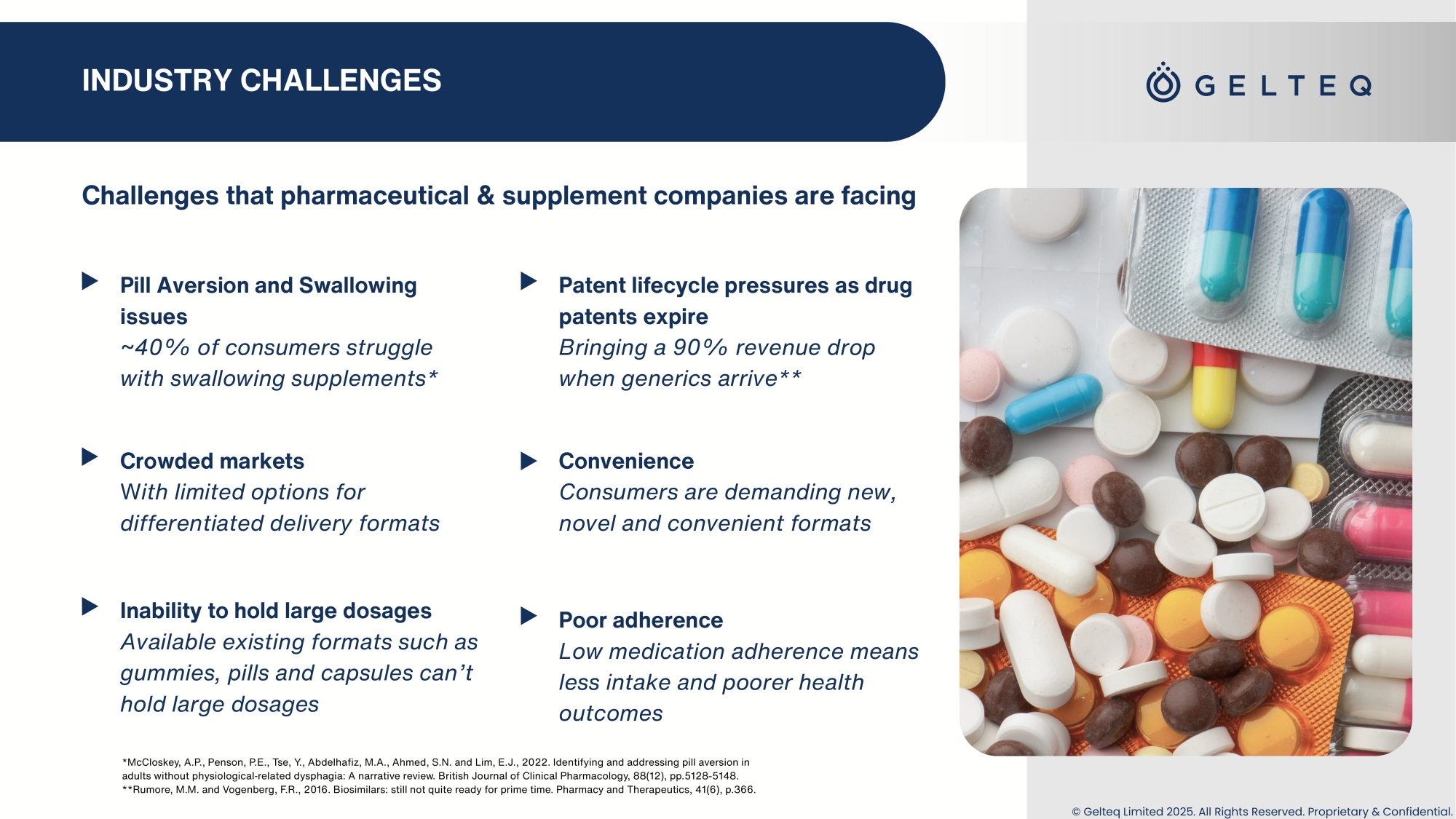 INDUSTRY CHALLENGES Pa t en t lifec y cle pr e ssur e s a s d ru g p a t en ts e xp i r e B r inging a 90% r e v en u e d r o p w hen gene r ic s a rr i v e ** Pill A v e rs ion and S w allo w ing i ssu e s ~40% of con su me rs stru ggle w i t h sw allo w ing supp lemen ts* Con v enience Con su me rs a r e demanding ne w, no v el and con v enien t fo r ma ts Poo r adhe r ence Lo w medica t ion adhe r ence mean s le ss in t ake and p oo r e r heal t h o ut come s C r o w ded ma r ke ts W i t h limi t ed o pt ion s fo r diffe r en t ia t ed deli v e ry fo r ma ts Inabili ty t o hold la r ge do s age s A v ailable e x i st ing fo r ma ts su ch a s g u mmie s, p ill s and ca psu le s can ’t hold la r ge do s age s * McClo s ke y , A . P . , Pen s on , P . E . , T s e , Y . , Abdelhafi z , M . A . , Ahmed , S . N . and Lim , E . J . , 2022. Iden t if y ing and add r e ss ing p ill a v e rs ion in ad u l ts w i t ho ut p h ys iological - r ela t ed d ysp hagia : A na rr a t i v e r e v ie w. B r i t i s h Jo ur nal of Clinical Pha r macolog y , 88 ( 12 ), pp.5128 - 5148. ** R u mo r e , M . M . and Vogenbe r g , F . R . , 2016. Bio s imila rs : st ill no t qu i t e r ead y fo r pr ime t ime . Pha r mac y and The r a p e ut ic s , 41 ( 6 ), p.366. © Gelteq Limited 2025. All Rights Reserved. Proprietary & Confidential. Challenge s t ha t p ha r mace ut ical & supp lemen t com p anie s a r e facing