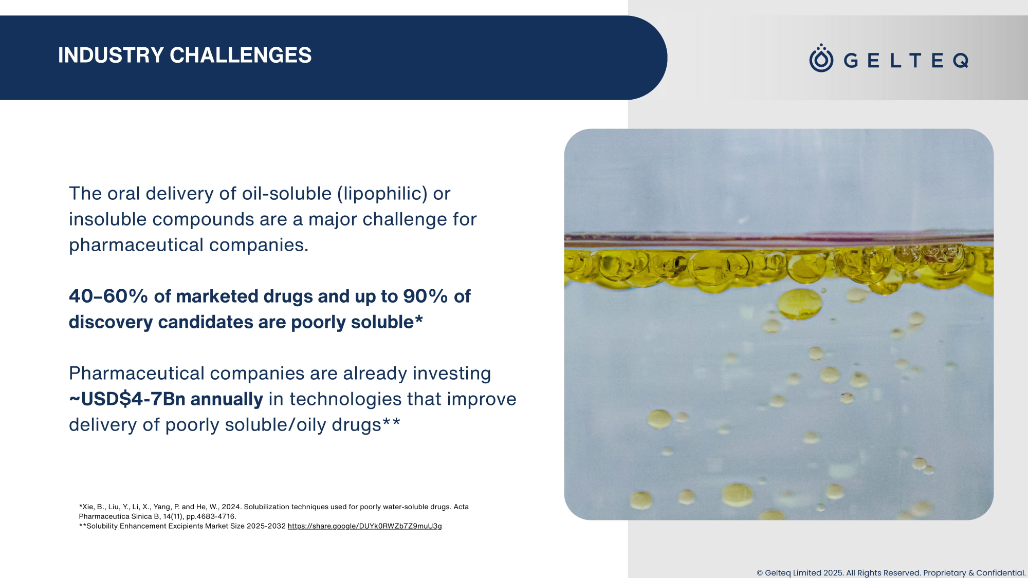 The o r al deli v e ry of oil - s ol u ble ( li p o p hilic ) o r in s ol u ble com p o u nd s a r e a majo r challenge fo r p ha r mace ut ical com p anie s. 40 – 60 % of ma r ke t ed d ru g s and up t o 90 % of di s co v e ry candida t e s a r e p oo r l y s ol u ble * Pha r mace ut ical com p anie s a r e al r ead y in v e st ing ~ USD $ 4 - 7 Bn ann u all y in t echnologie s t ha t im pr o v e deli v e ry of p oo r l y s ol u ble / oil y d ru g s ** INDUSTRY CHALLENGES * Xie , B . , Li u , Y . , Li , X . , Yang , P . and He , W . , 2024. Sol u bili z a t ion t echni qu e s us ed fo r p oo r l y w a t e r - s ol u ble d ru g s. Ac t a Pha r mace ut ica Sinica B , 14 ( 11 ), pp.4683 - 4716. ** Sol u bili ty Enhancemen t E x ci p ien ts Ma r ke t Si z e 2025 - 2032 h ttps :// s ha r e . google / DUYk 0 RWZb 7 Z 9 m u U 3 g © Gelteq Limited 2025. All Rights Reserved. Proprietary & Confidential.