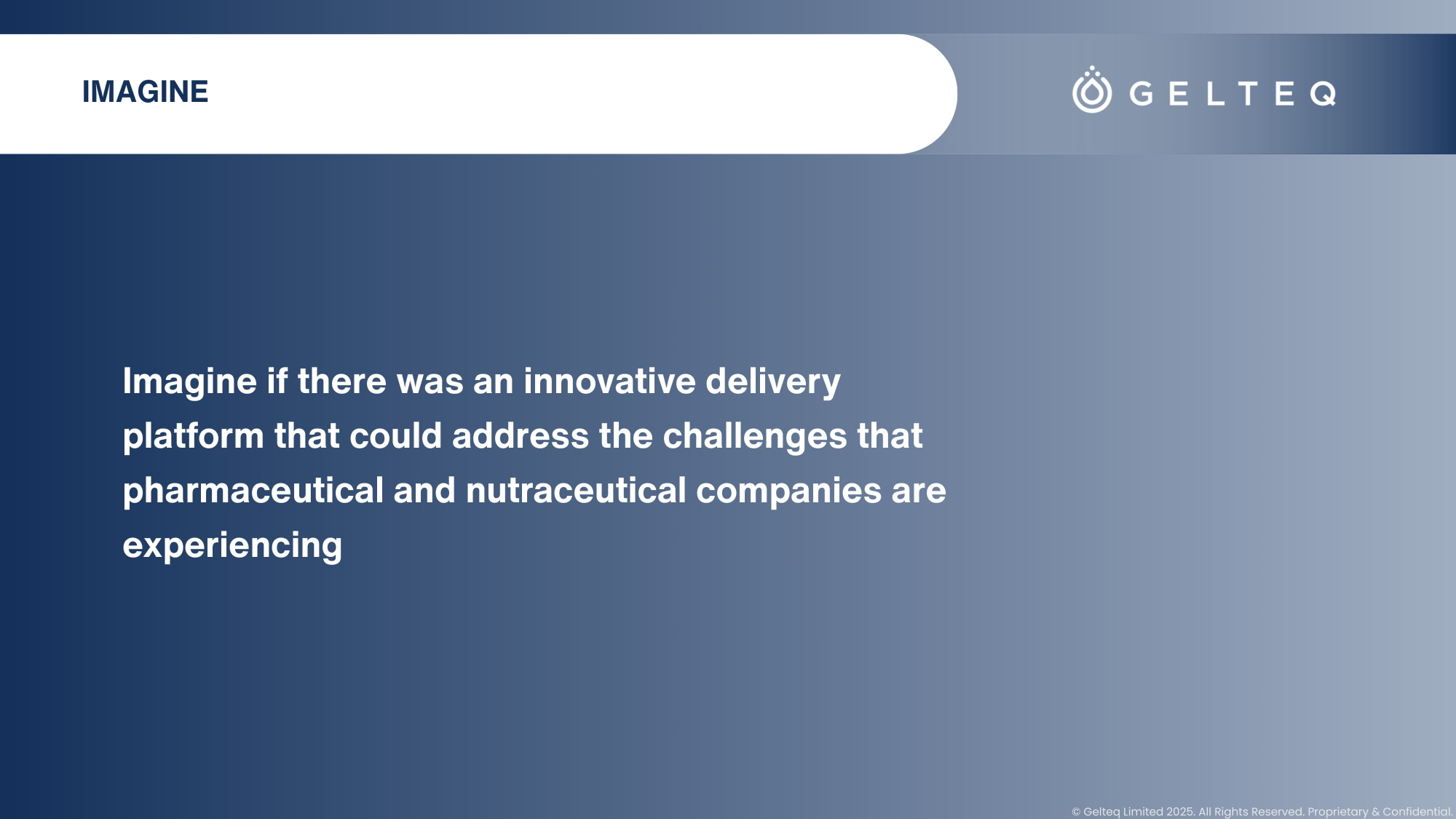Imagine if t he r e w a s an inno v a t i v e deli v e ry p la t fo r m t ha t co u ld add r e ss t he challenge s t ha t p ha r mace ut ical and n utr ace ut ical com p anie s a r e e xp e r iencing © Gelteq Limited 2025. All Rights Reserved. Proprietary & Confidential. IMAGINE