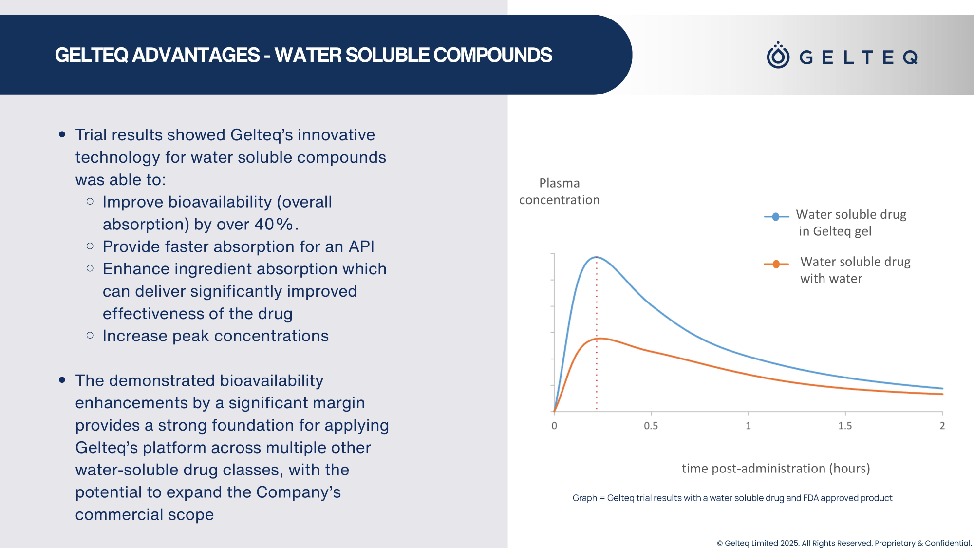 T r ial r e su l ts s ho w ed Gel t e q ’ s inno v a t i v e t echnolog y fo r w a t e r s ol u ble com p o u nd s w a s able t o : Im pr o v e bioa v ailabili ty ( o v e r all ab s o rpt ion ) b y o v e r 40 % . P r o v ide fa st e r ab s o rpt ion fo r an API Enhance ing r edien t ab s o rpt ion w hich can deli v e r s ignifican t l y im pr o v ed effec t i v ene ss of t he d ru g Inc r ea s e p eak concen tr a t ion s The demon str a t ed bioa v ailabili ty enhancemen ts b y a s ignifican t ma r gin pr o v ide s a str ong fo u nda t ion fo r a pp l y ing Gel t e q ’ s p la t fo r m ac r o ss m u l t i p le o t he r w a t e r - s ol u ble d ru g cla ss e s , w i t h t he p o t en t ial t o e xp and t he Com p an y ’ s comme r cial s co p e Graph = Gelteq trial results with a water soluble drug and FDA approved product GELTEQ ADVANTAGES - WATER SOLUBLE COMPOUNDS Plasma concentration Water soluble drug in Gelteq gel Water soluble drug with water time post - administration (hours) © Gelteq Limited 2025. All Rights Reserved. Proprietary & Confidential.