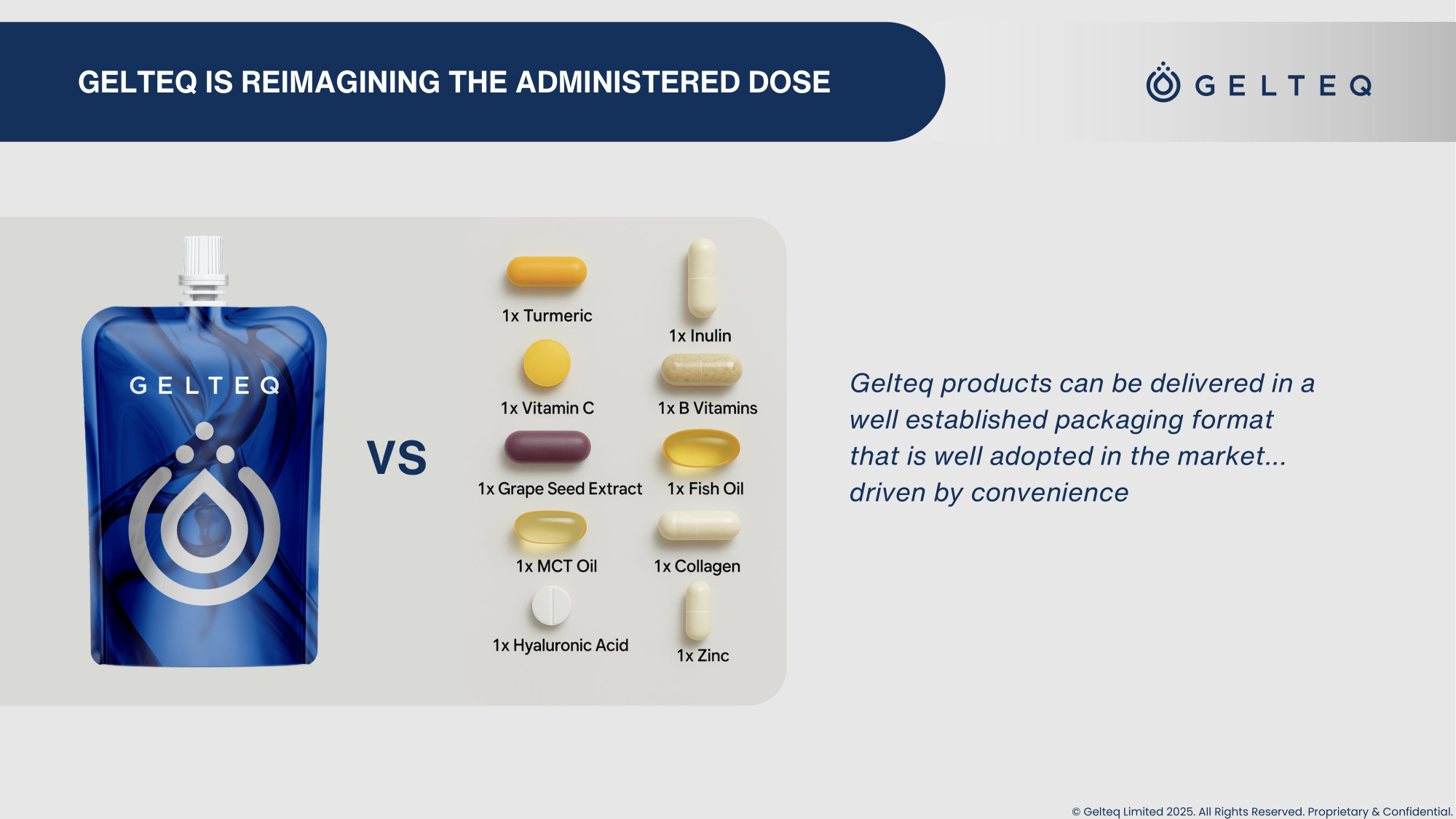 GELTEQ IS REIMAGINING THE ADMINISTERED DOSE © Gelteq Limited 2025. All Rights Reserved. Proprietary & Confidential. Gel t e q pr od u c ts can be deli v e r ed in a w ell e st abli s hed p ackaging fo r ma t t ha t i s w ell ado pt ed in t he ma r ke t... d r i v en b y con v enience VS