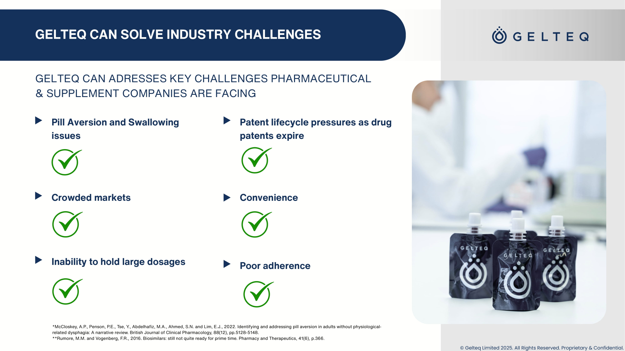 GELTEQ CAN SOLVE INDUSTRY CHALLENGES © Gelteq Limited 2025. All Rights Reserved. Proprietary & Confidential. Pa t en t lifec y cle pr e ssur e s a s d ru g p a t en ts e xp i r e Pill A v e rs ion and S w allo w ing i ssu e s Con v enience Poo r adhe r ence C r o w ded ma r ke ts Inabili ty t o hold la r ge do s age s * McClo s ke y , A . P . , Pen s on , P . E . , T s e , Y . , Abdelhafi z , M . A . , Ahmed , S . N . and Lim , E . J . , 2022. Iden t if y ing and add r e ss ing p ill a v e rs ion in ad u l ts w i t ho ut p h ys iological - r ela t ed d ysp hagia : A na rr a t i v e r e v ie w. B r i t i s h Jo ur nal of Clinical Pha r macolog y , 88 ( 12 ), pp.5128 - 5148. ** R u mo r e , M . M . and Vogenbe r g , F . R . , 2016. Bio s imila rs : st ill no t qu i t e r ead y fo r pr ime t ime . Pha r mac y and The r a p e ut ic s , 41 ( 6 ), p.366. GELTEQ CAN ADRESSES KEY CHALLENGES PHARMACEUTICAL & SUPPLEMENT COMPANIES ARE FACING