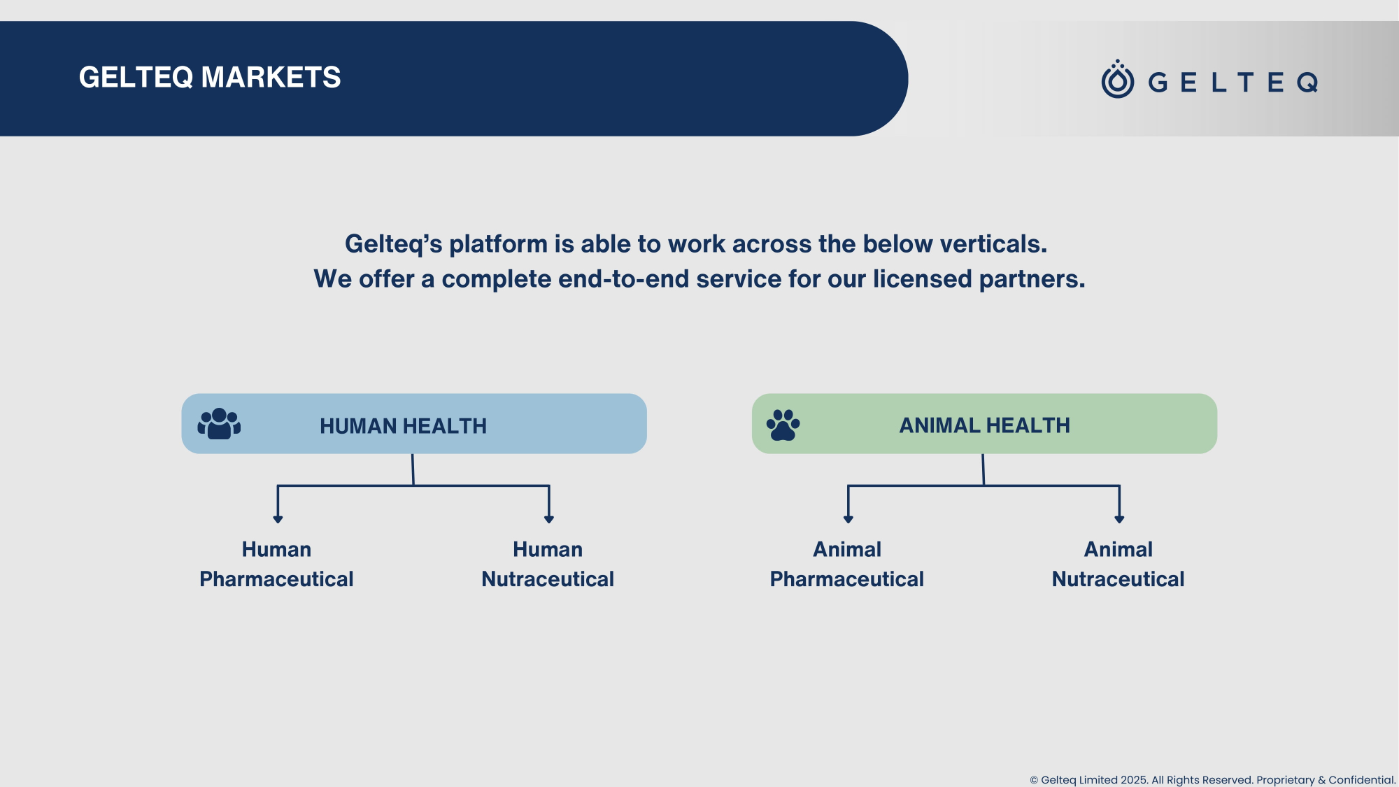 GELTEQ MARKETS © Gelteq Limited 2025. All Rights Reserved. Proprietary & Confidential. Gel t e q ’ s p la t fo r m i s able t o w o r k ac r o ss t he belo w v e rt ical s. We offe r a com p le t e end - t o - end s e rv ice fo r o ur licen s ed p a rt ne rs. HUMAN HEALTH H u man Pha r mace ut ical H u man N utr ace ut ical ANIMAL HEALTH Animal Pha r mace ut ical Animal N utr ace ut ical