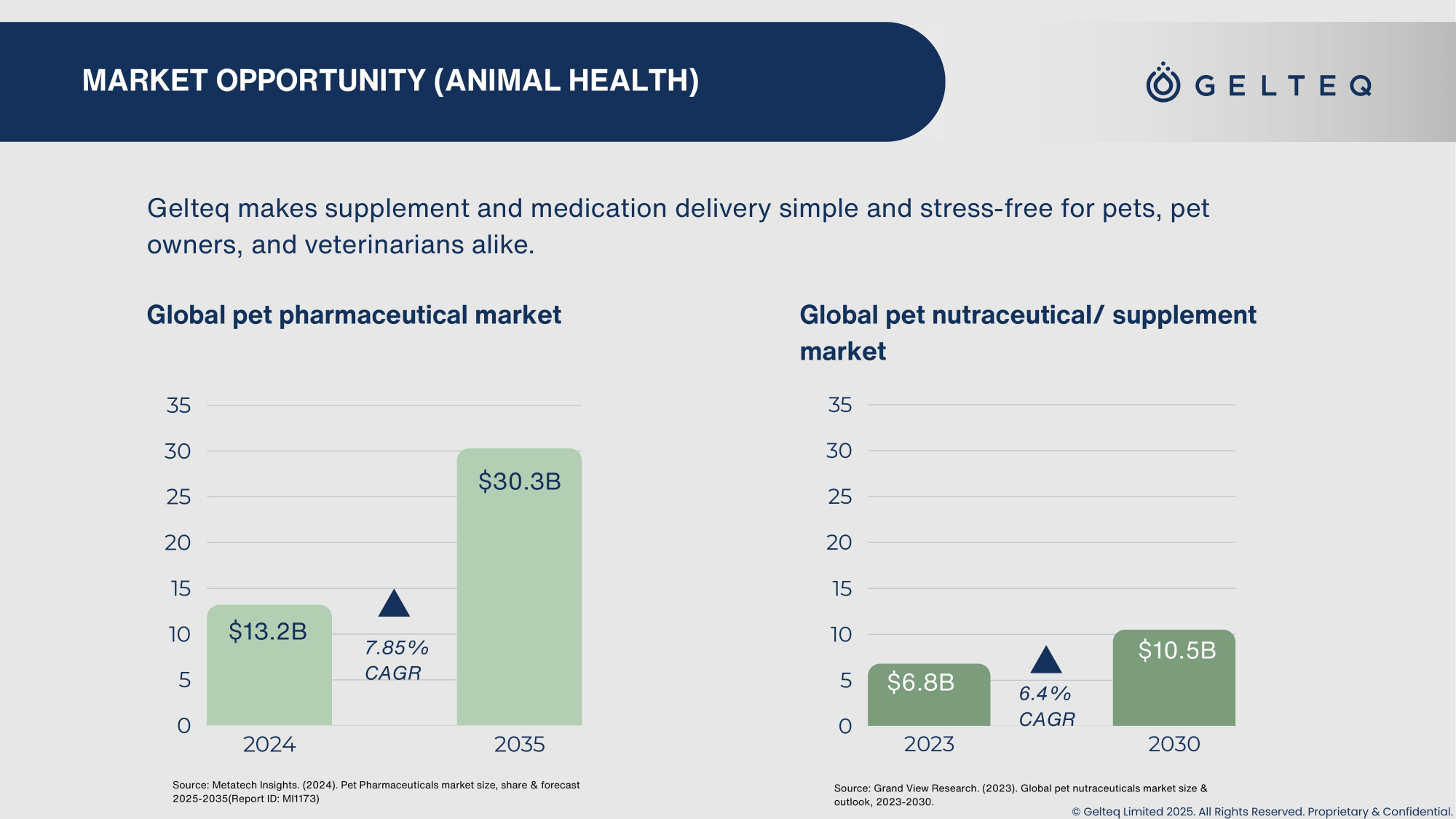 2024 2035 35 30 25 20 15 10 5 0 MARKET OPPORTUNITY ( ANIMAL HEALTH ) Global p e t p ha r mace ut ical ma r ke t $ 13.2B 7.85% CAGR $ 30.3B Gelteq makes supplement and medication delivery simple and stress - free for pets , pet owners , and veterinarians alike. 2023 2030 © Gelteq Limited 2025. All Rights Reserved. Proprietary & Confidential. 35 30 25 20 15 10 5 0 Global p e t n utr ace ut ical / supp lemen t ma r ke t $ 6.8 B 6.4% CAGR $ 10.5 B So ur ce: G r and Vie w Re s ea r ch . ( 2023 ) . Global p e t n utr ace ut ical s ma r ke t s i z e & o ut look, 2023 - 2030. So ur ce: Me t a t ech In s igh ts. ( 2024 ) . Pe t Pha r mace ut ical s ma r ke t s i z e, s ha r e & fo r eca st 2025 - 2035 (Re p o rt ID: MI 1173 )