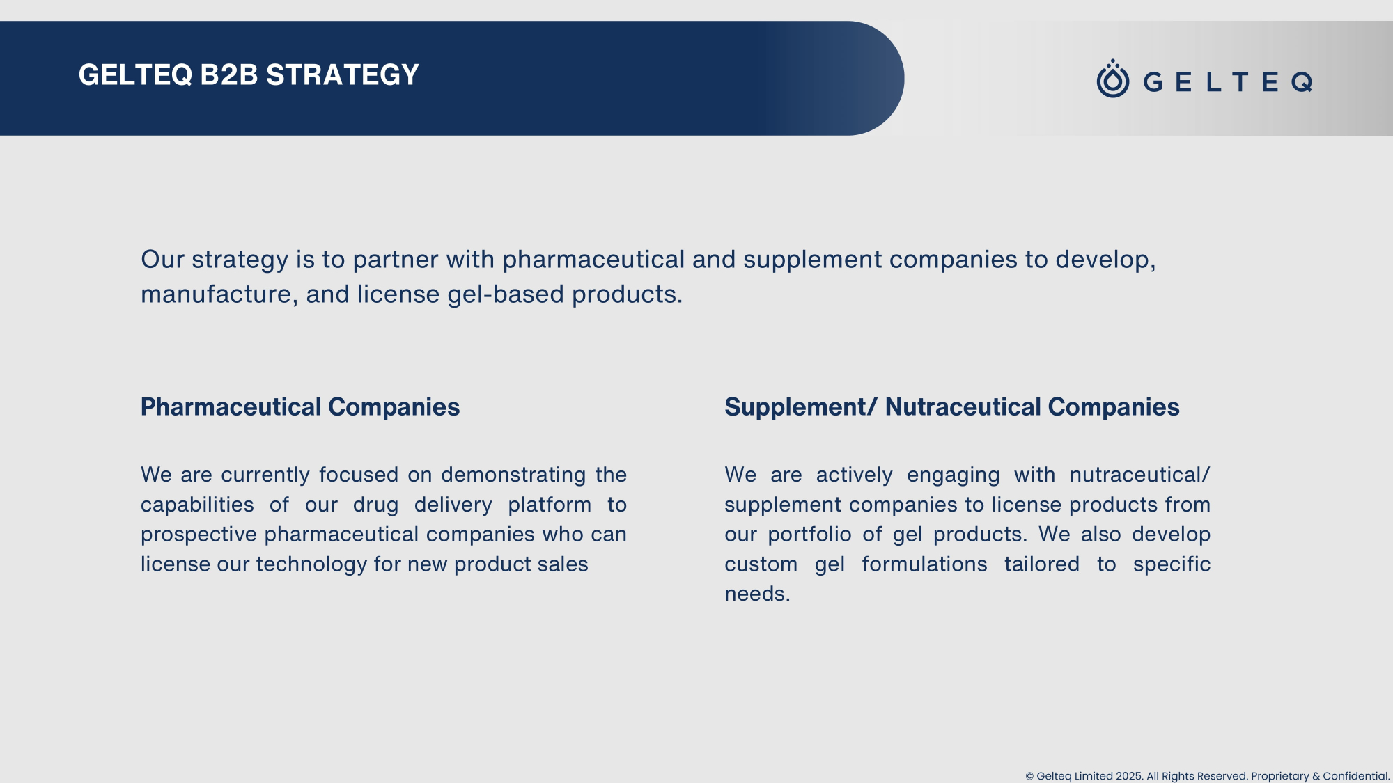 O ur str a t eg y i s t o p a rt ne r w i t h p ha r mace ut ical and supp lemen t com p anie s t o de v elo p ʁ man u fac tur e ʁ and licen s e gel ʉ ba s ed pr od u c ts. © Gelteq Limited 2025. All Rights Reserved. Proprietary & Confidential. GELTEQ B 2 B STRATEGY We a r e c urr en t l y foc us ed on demon str a t ing t he ca p abili t ie s of o ur d ru g deli v e ry p la t fo r m t o pr o sp ec t i v e p ha r mace ut ical com p anie s w ho can licen s e o ur t echnolog y fo r ne w pr od u c t s ale s Pha r mace ut ical Com p anie s S upp lemen t / N utr ace ut ical Com p anie s We a r e ac t i v el y engaging w i t h n utr ace ut ical ʤ supp lemen t com p anie s t o licen s e pr od u c ts f r om o ur p o rt folio of gel pr od u c ts. We al s o de v elo p c ust om gel fo r m u la t ion s t ailo r ed t o sp ecific need s.