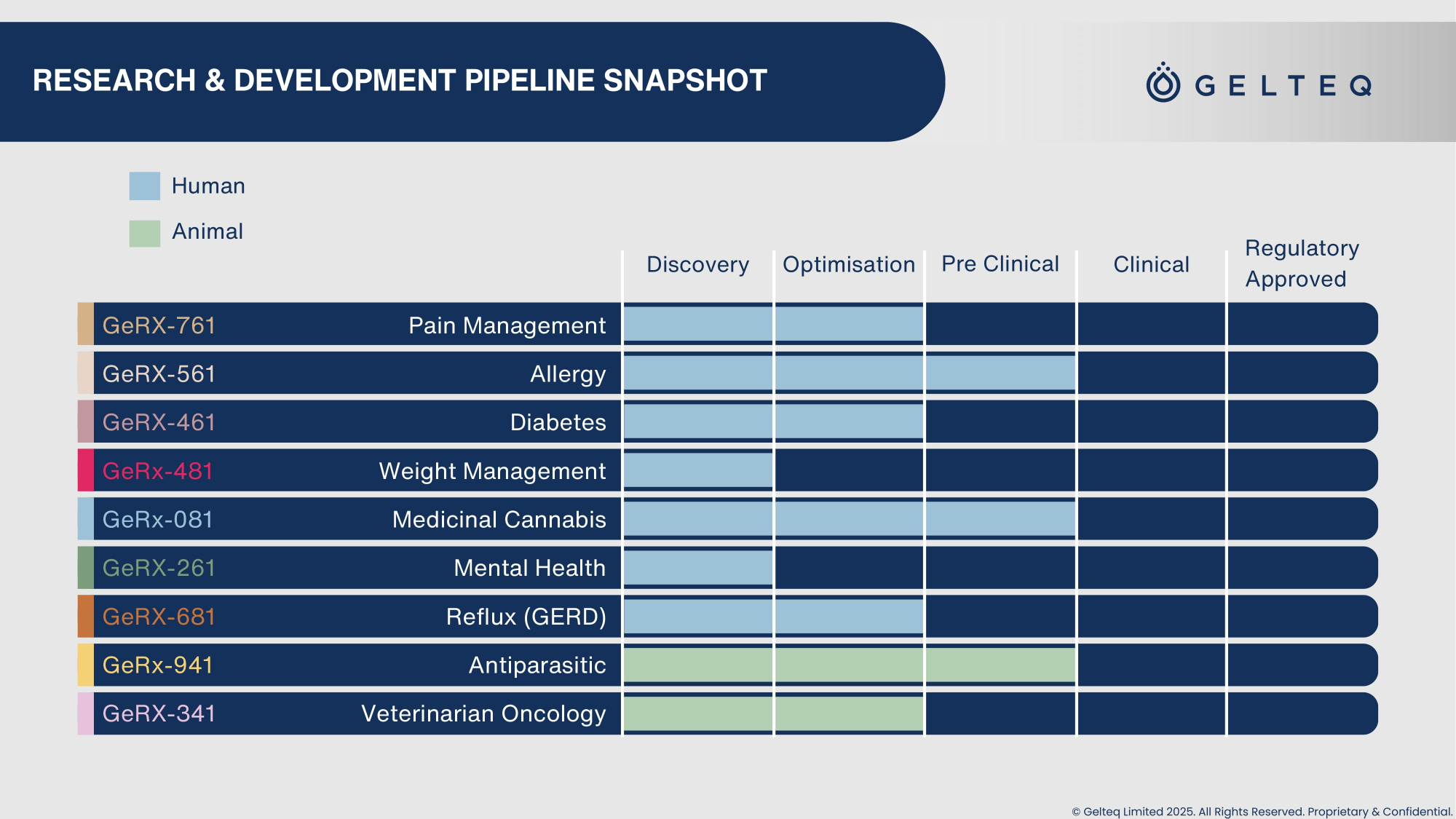 RESEARCH & DEVELOPMENT PIPELINE SNAPSHOT © Gelteq Limited 2025. All Rights Reserved. Proprietary & Confidential. Pain Managemen t Alle r g y Diabe t e s Weigh t Managemen t Medicinal Cannabi s Men t al Heal t h Refl ux ( GERD ) An t i p a r a s i t ic Ve t e r ina r ian Oncolog y GeRX - 761 GeRX - 561 GeRX - 461 GeR x - 481 GeR x - 081 GeRX - 261 GeRX - 681 GeRx - 941 GeRX - 341 H u man Animal Di s co v e ry P r e Clinical Clinical Reg u la t o ry A ppr o v ed O pt imi s a t ion