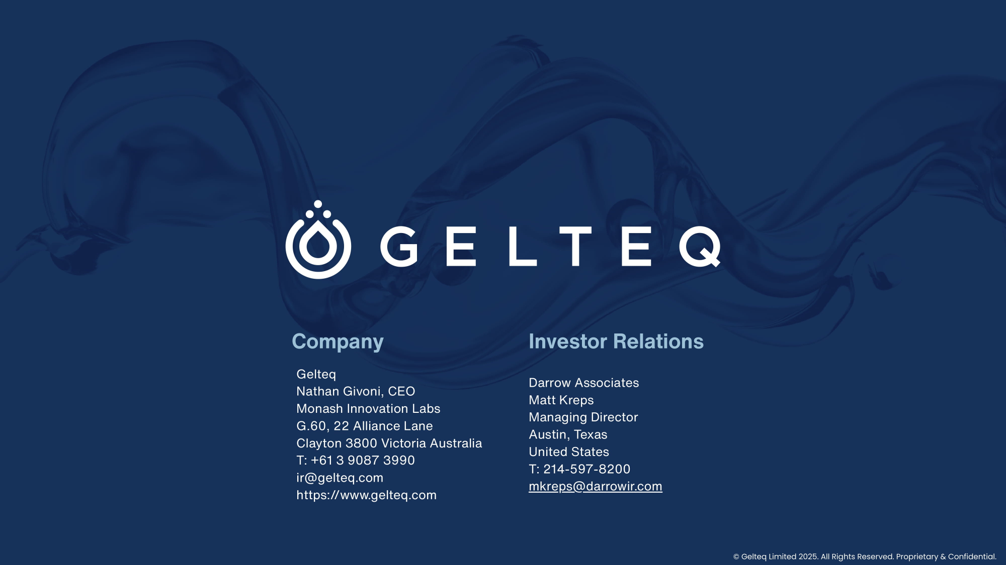 Da rr o w A ss ocia t e s Ma tt K r e ps Managing Di r ec t o r A ust in, Te x a s Uni t ed S t a t e s T: 214 - 597 - 8200 mk r e ps @ da rr o w i r. com In v e st o r Rela t ion s Gel t e q Na t han Gi v oni, CEO Mona s h Inno v a t ion Lab s G .60 , 22 Alliance Lane Cla yt on 3800 Vic t o r ia A ustr alia T: + 61 3 9087 3990 i r @gel t e q. com h ttps :// www. gel t e q. com Com p an y © Gelteq Limited 2025. All Rights Reserved. Proprietary & Confidential.