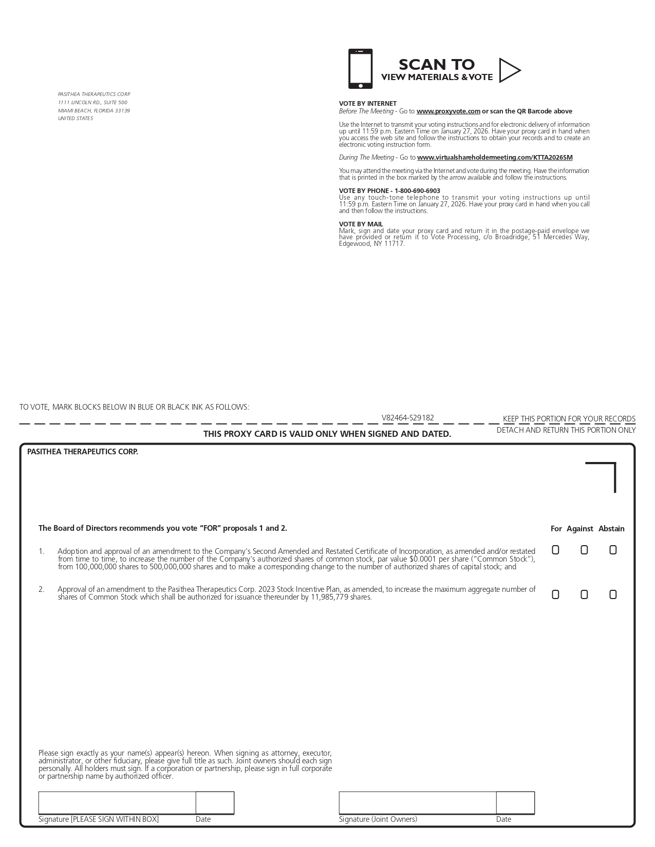 Signature [PLEASE SIGN WITHIN BOX] Date Signature (Joint Owners) Date TO VOTE, MARK BLOCKS BELOW IN BLUE OR BLACK INK AS FOLLOWS: KEEP THIS PORTION FOR YOUR RECORDS DETACH AND RETURN THIS PORTION ONLY THIS PROXY CARD IS VALID ONLY WHEN SIGNED AND DATED. V82464 - S29182 For Against Abstain ! ! ! ! ! ! 1 . Adoption and approval of an amendment to the Company's Second Amended and Restated Certificate of Incorporation, as amended and/or restated from time to time, to increase the number of the Company's authorized shares of common stock, par value $ 0 . 0001 per share (“Common Stock”), from 100 , 000 , 000 shares to 500 , 000 , 000 shares and to make a corresponding change to the number of authorized shares of capital stock ; and 2. Approval of an amendment to the Pasithea Therapeutics Corp. 2023 Stock Incentive Plan, as amended, to increase the maximum aggregate number of shares of Common Stock which shall be authorized for issuance thereunder by 11,985,779 shares. Please sign exactly as your name(s) appear(s) hereon . When signing as attorney, executor, administrator, or other fiduciary, please give full title as such . Joint owners should each sign personally . All holders must sign . If a corporation or partnership, please sign in full corporate or partnership name by authorized officer . PASITHEA THERAPEUTICS CORP. The Board of Directors recommends you vote “FOR” proposals 1 and 2. SCAN TO VIEW MATERIALS & VOTE I> PASITHEA THERAPEUTICS CORP. 1111 LINCOLN RD., SUITE 500 MIAMI BEACH, FLORIDA 33139 UNITED STATES VOTE BY INTERNET Before The Meeting - Go to www.proxyvote.com or scan the QR Barcode above Use the Internet to transmit your voting instructions and for electronic delivery of information up until 11 : 59 p . m . Eastern Time on January 27 , 2026 . Have your proxy card in hand when you access the web site and follow the instructions to obtain your records and to create an electronic voting instruction form . During The Meeting - Go to www.virtualshareholdermeeting.com/KTTA2026SM You may attend the meeting via the Internet and vote during the meeting . Have the information that is printed in the box marked by the arrow available and follow the instructions . VOTE BY PHONE - 1 - 800 - 690 - 6903 Use any touch - tone telephone to transmit your voting instructions up until 11 : 59 p . m . Eastern Time on January 27 , 2026 . Have your proxy card in hand when you call and then follow the instructions . VOTE BY MAIL Mark, sign and date your proxy card and return it in the postage - paid envelope we have provided or return it to Vote Processing, c/o Broadridge, 51 Mercedes Way, Edgewood, NY 11717 .