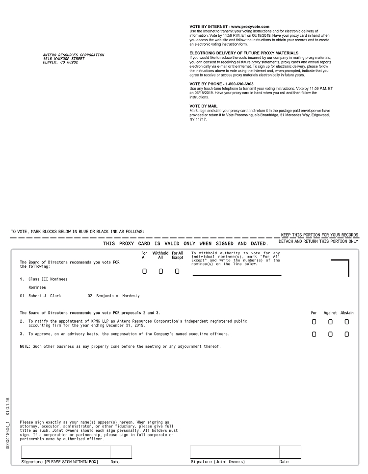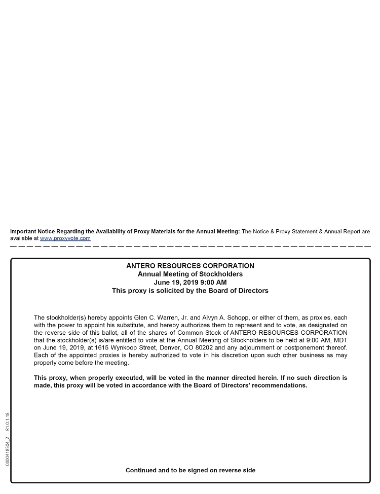 The Notice of 2019 Annual Meeting of Shareholders and Proxy Statement, along with Antero’s Annual Report on Form 10-K for the year ended December 31, 2018, filed with the Securities and Exchange Commission on February 13, 2019, and Antero’s 2018 Annual Report to Shareholders are available free of charge at www.anteroresources.com in the “SEC Filings” subsection under the “Investors” section.