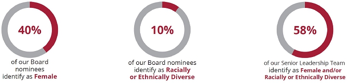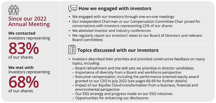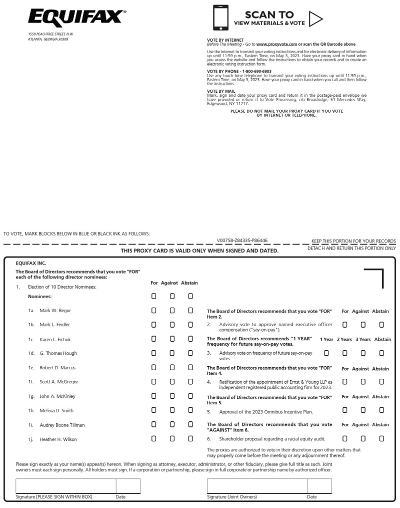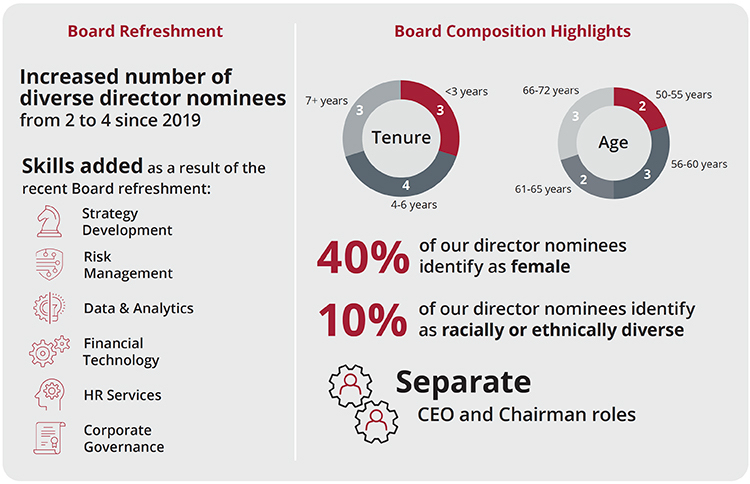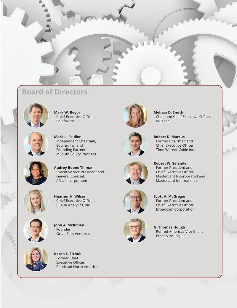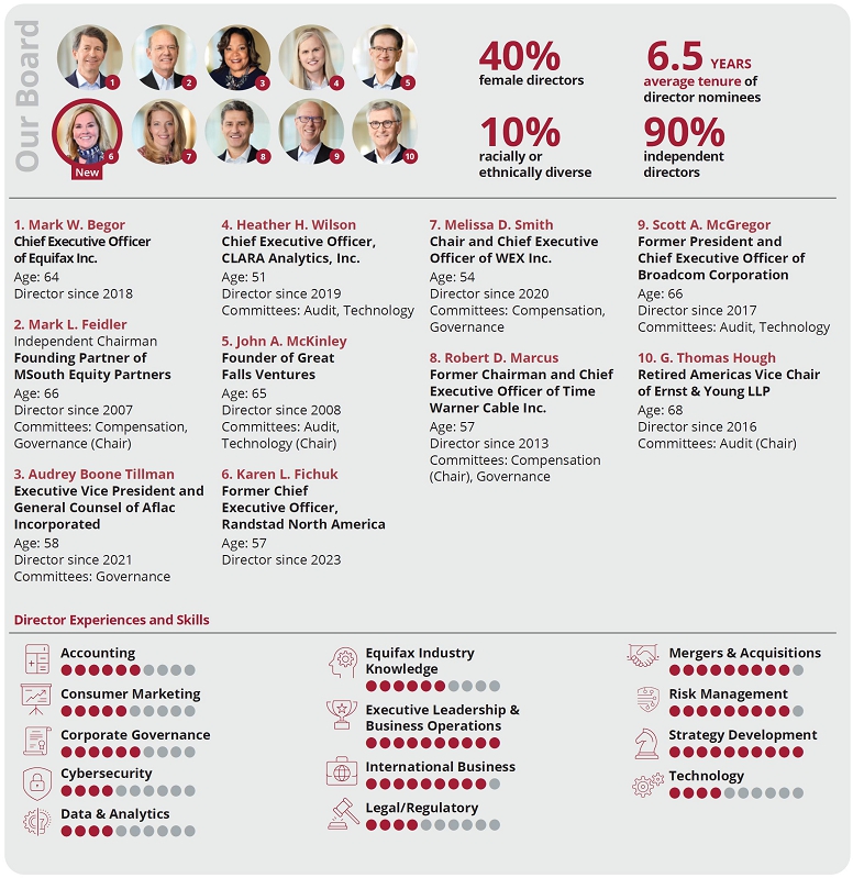 In January 2023, Equifax appointed Karen Fichuk, former Chief Executive Officer of Randstad North America, as an independent director. Fichuk’s election is part of the board’s regular succession planning process in connection with the scheduled retirement of independent director Bob Selander in May 2023. Forty percent of our director nominees for election at the 2023 Annual Meeting identify as female.
