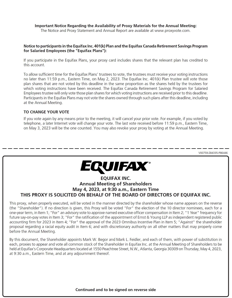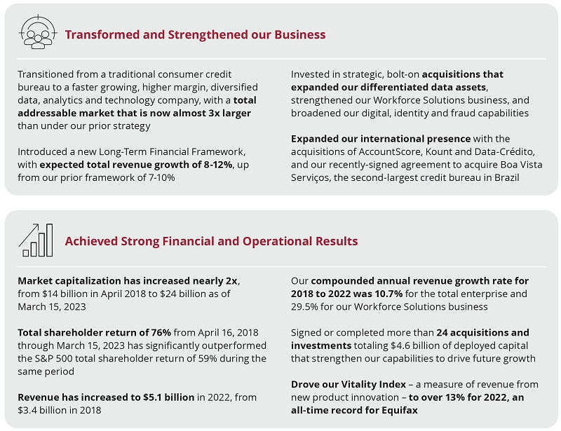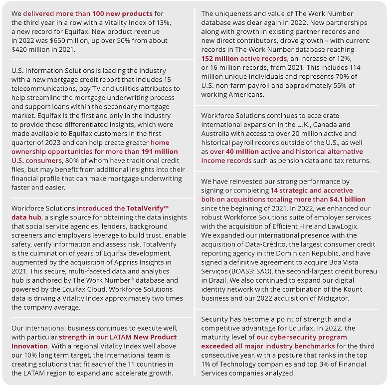 | • | The experience of our U.S. myEquifax consumer portal, which surpassed 17 million users, 5.9 million Core Credit™ subscribers, and 626,000 paid product subscribers in 2022, has evolved over the last year to include access to new offers and services, helping to simplify processes like finding auto loans on behalf of the consumers we serve. |