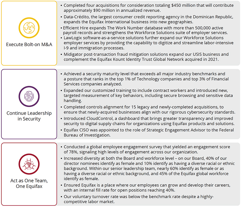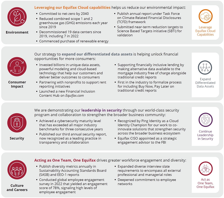 In support of our commitment to inclusion and diversity and the creation of an environment where all team members can flourish, we also developed and launched the Equifax Inclusive Leader Framework in 2022 to articulate the habits and behaviors expected of leaders across Equifax. And all members of our Global Leadership Team had an ESG goal as part of their performance objectives last year.