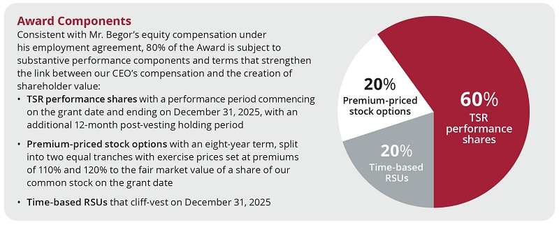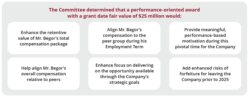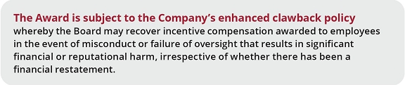 | (c) | Non-Employee Director Limitations. The aggregate grant date fair value (computed as of the date of grant in accordance with applicable financial accounting rules) of all equity-based Awards granted to any Non-Employee Director during any single calendar year, plus the total cash compensation paid to such Director for services rendered for such calendar year, shall not exceed $800,000; provided, however, that the limitation described in this Section shall be determined without regard to amounts paid to a Non-Employee Director during any period in which such individual was an employee or consultant (other than grants of Awards paid for service in their capacity as a Non-Employee Director), and any severance and other payments such as consulting fees paid to a Non-Employee Director for such Director’s prior or current service to the Company or any Subsidiary other than serving as a Director shall not be taken into account in applying the limit provided above. For the avoidance of doubt, any compensation that is deferred shall be counted toward this limit for the year in which it was first earned, and not when paid or settled if later. |