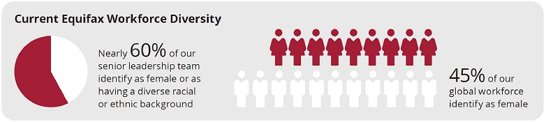 Equifax makes quantitative Environmental, Social and Governance (ESG) diversity disclosures available annually in accordance with the Sustainability Accounting Standards Board (SASB) framework, and we were one of the first in our industry to publicly disclose our Equal Employment Opportunity (EEO-1) and SASB diversity reports. We are committed to nurturing a culture where everyone feels welcomed, valued and respected. Within our senior leadership team, nearly 60% identify as female or as having a diverse racial or ethnic background, and 45% of the Equifax global workforce identify as female.