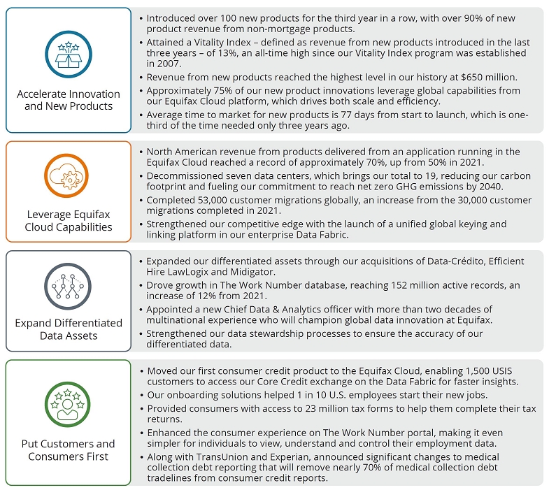 In 2022, we harnessed the power of our new Equifax Cloud™ capabilities and differentiated data to deliver more than 100 new products for a record setting Vitality Index (defined as revenue from new products introduced in the last three years) of 13%, which is well above our 10% long term vitality target for new products and 400 basis points above 2021. North American revenue from products delivered from an application running in the new Equifax Cloud reached a record of approximately 70%, up from 50% in 2021. We also continued to invest in strategic, bolt-on acquisitions to strengthen our company and drive future growth and have signed or completed 14 transactions for consideration totaling $4.1 billion since the beginning of 2021. We continue to set ourselves apart in the industry with innovative solutions and differentiated data assets that ‘Only Equifax’ can provide.