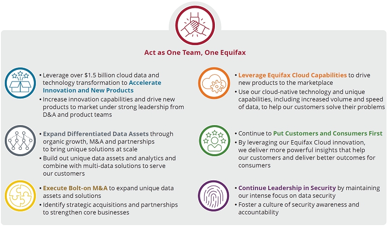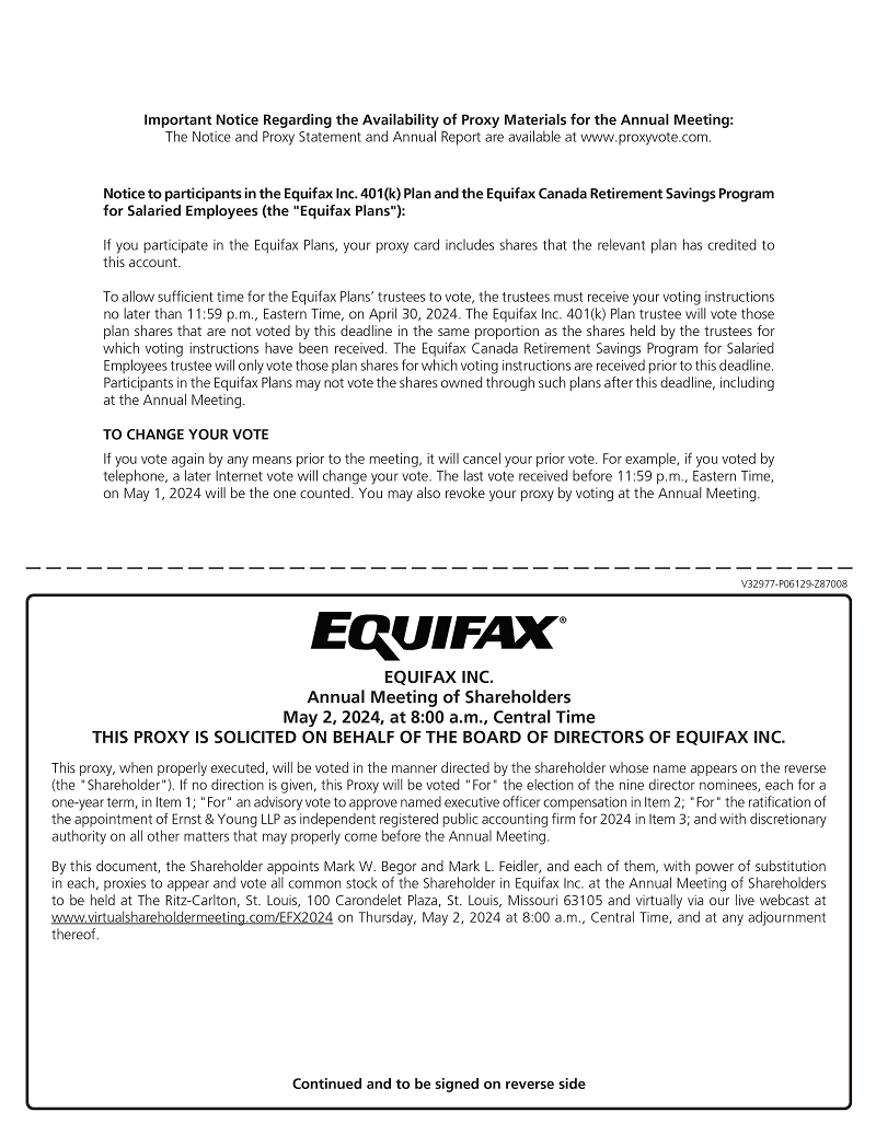 This Proxy Statement contains information that may constitute “forward-looking statements.” Generally, the words “believe,” “expect,” “intend,” “estimate,” “anticipate,” “project,” “will,” “may” and similar expressions identify forward-looking statements, which generally are not historical in nature. All statements that address future operating performance and events or developments that we expect or anticipate will occur in the future, including statements relating to future operating results, improvements in our information technology and data security infrastructure, including as a part of our cloud technology transformation, our strategy, the expected financial and operational benefits, synergies and growth from our acquisitions, changes in U.S. and worldwide economic conditions, such as changes in interest rates and inflation, that materially impact consumer spending, home prices, investment values, consumer debt, unemployment rates and the demand for Equifax’s products and services, our culture, our ability to innovate, the market acceptance of new products and services and similar statements about our business plans are forward-looking statements. Management believes that these forward-looking statements are reasonable as and when made. However, forward-looking statements are subject to certain risks and uncertainties that could cause actual results to differ materially from the Company’s historical experience and our present expectations or projections, including without limitation our expectations regarding the Company’s outlook, long-term organic and inorganic growth, and customer acceptance of our business solutions referenced in “Item 1. Business” and in “Item 7. Management’s Discussion and Analysis of Financial Condition and Results of Operation – Business Overview” of our Annual Report on Form 10-K for the year ended December 31, 2023. These risks and uncertainties include, but are not limited to, those described in “Item 1A. Risk Factors,” and elsewhere in our Annual Report on Form 10-K for the year ended December 31, 2023, and those described from time to time in our future reports filed with the United States Securities and Exchange Commission. As a result of such risks and uncertainties, we urge you not to place undue reliance on any such forward-looking statements. Forward-looking statements speak only as of the date when made. We undertake no obligation to publicly update or revise any forward-looking statements, whether as a result of new information, future events or otherwise, except as required by law.